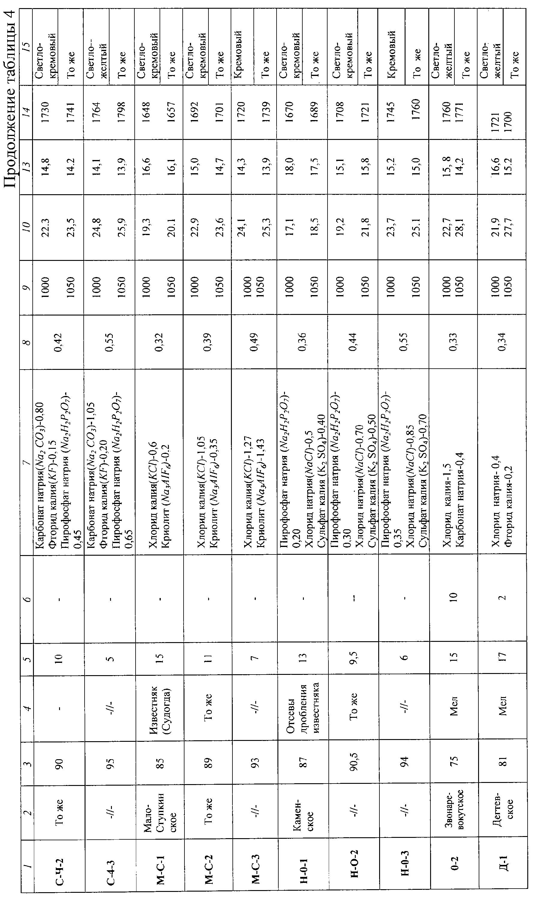 Температура обжига – 1000-1050°С. При этих параметрах автором получены образцы светло-кремового цвета однородной окраски. Учитывая тот факт, что у большинства изделий из легкоплавкого красножгущегося глинистого сырья при добавлении в него более 15% карбонатной породы значительно снижается прочность и повышается водопоглощение, использование предлагаемой массы в производственных условиях неэффективно. В этой связи авторами изобретения были проведены работы с использованием глинистого сырья пяти месторождений и различных видов карбонатных пород. В качестве красножгущегося глинистого сырья применяли Ново-Петровское (Краснодарский край), Большелоговское (Ростовская область), Сухо-Чалтырское (Ростовская область), Мало-Ступкинское (Ивановская область) и Каменское (Новосибирская область) месторождения. Легкоплавкое красножгущееся глинистое сырье этих месторождений по своей качественной характеристике является наиболее распространенным для производства керамических изделий (кирпича и камней). В качестве карбонатных пород было использовано сырье, добываемое в непосредственной близости от предприятий, выпускающих керамический кирпич (ракушка, мел, известняк, отсевы дробления известняка). Основные характеристики глинистого сырья и химический состав компонентов, используемых при выполнении экспериментальных работ, приведены в таблицах 1 и 2.