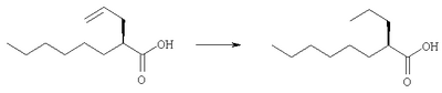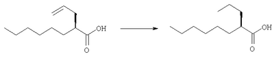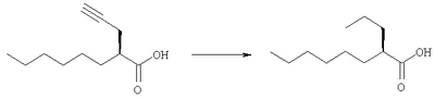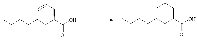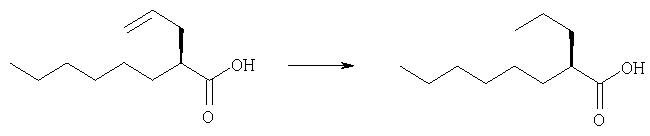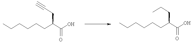 1. Способ получения 2(R)-2-пропилоктановой кислоты, отличающийся тем, что (2S)-2-(2-пропинил)октановую кислоту или (2S)-2-(2-пропенил)октановую кислоту восстанавливают в органическом растворителе в атмосфере водорода при температуре в интервале 0-60°С, используя платину на угле. 2. Способ по п.1, отличающийся тем, что (2S)-2-(2-пропинил)октановую кислоту восстанавливают, используя платину на угле. 3. Способ по п.1, отличающийся тем, что (2S)-2-(2-пропенил)октановую кислоту восстанавливают, используя платину на угле. 4. Продукт, включающий от 97,14 до 99,4% ээ 2(R)-2-пропилоктановой кислоты и 2(S)-2-пропилоктановую кислоту – остальное. 5. Продукт, включающий 2(R)-2-пропилоктановую кислоту, имеющую оптическую чистоту, по крайней мере, 97,14% ээ и 2(S)-2-пропилоктановую кислоту – остальное. 6. Продукт по п.5, в котором оптическая чистота 2(R)-2-пропилоктановой кислоты составляет, по крайней мере, 99,4% ээ.