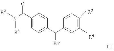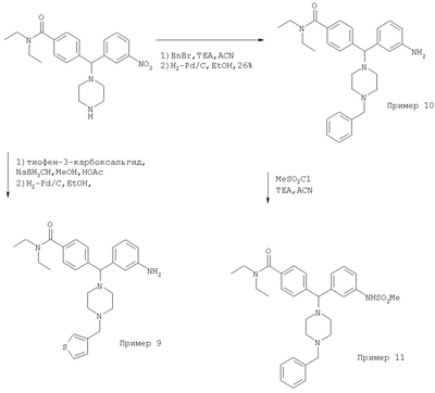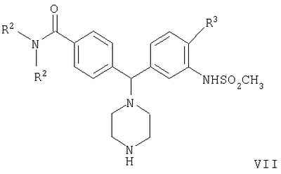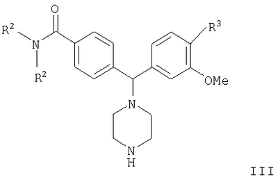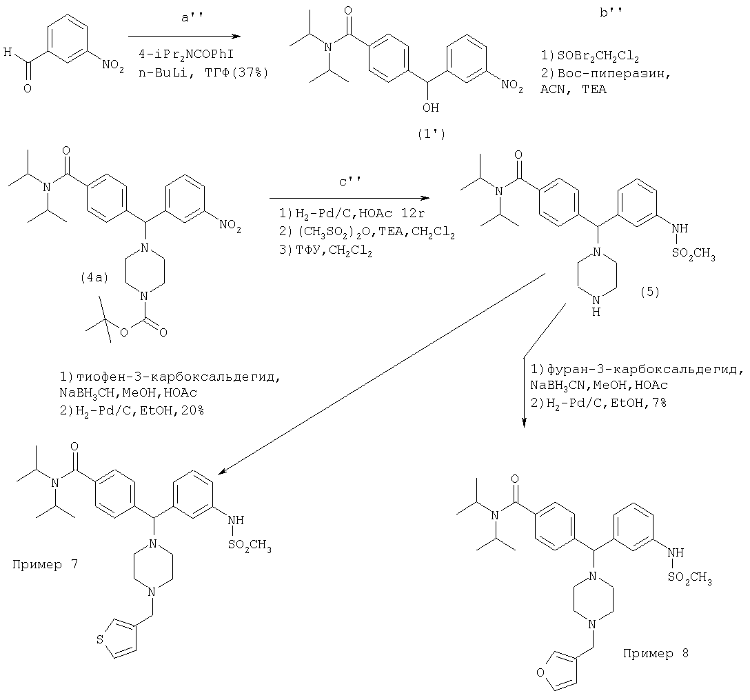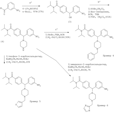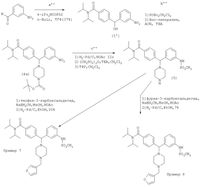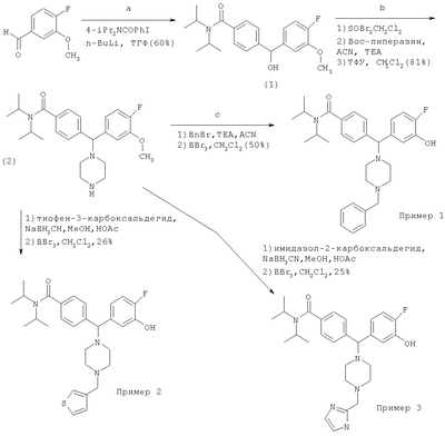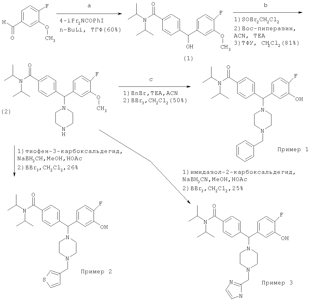 которое затем подвергают алкилированию в восстановительных условиях соединением формулы R1-CHO с последующим восстановлением нитрогруппы с использованием водорода и палладия на угле с получением соединения формулы I, где R4 представляет собой -NH2. Получение метилсульфонанилидов. Примеры 7-8 Соединение формулы I, где R4 представляет собой -NHSO2R5, получают путем осуществления взаимодействия соединения общей формулы VI где R2 и R3 являются такими, как определено в п.1, a R4 представляет собой NO2, с Вос-пиперазином в ацетонитриле в присутствие триэтиламина в стандартных условиях с последующими восстановлением нитрогруппы путем гидрогенолиза с использованием палладия на угле в качестве катализатора, метансульфонилированием с использованием метансульфонилангидрида в дихлорметане в присутствии триэтиламина, а затем удалением защитной группы Вос в стандартных условиях с получением соединения формулы VII которое затем подвергают алкилированию в восстановительных условиях соединением формулы R1-CHO с последующим восстановлением нитрогруппы с использованием водорода и палладия на угле с получением соединения формулы I, где R4 представляет собой -NHSO2R5. В объем настоящего изобретения также входят отдельные энантиомеры и соли соединений формулы I, включая соли энантиомеров. Соединения формулы I являются хиральными соединениями с диарилметилпиперазиновой группой в качестве хирального центра, смотри формулу I* ниже. Следующим воплощением настоящего изобретения, таким образом, является (-)-энантиомер соединения формулы I, а также соль указанного соединения. Еще одним воплощением настоящего изобретения, таким образом, является (+)-энантиомер соединения формулы I, а также соль указанного соединения. ПРИМЕРЫ Далее изобретение будет описано более подробно с помощью следующих Примеров, которые не следует рассматривать как ограничивающие изобретение. Схема 1: Получение фторфенолов. Примеры 1-3 Промежуточное соединение 1: 4-[(4-Фтор-3-метоксифенил)(гидрокси)-метил]-N,N-диизопропил-бензамид N,N-Диизопропил-4-йодбензамид (6,0 г, 18 ммоль) растворяли в ТГФ (200 мл) и охлаждали до -78°С в атмосфере азота. N-BuLi (14 мл, 1,3 М раствор в гексане, 18 ммоль) добавляли по каплям в течение 10 мин при температуре от -65°С до -78°С. Добавляли по каплям 4-фтор-3-метоксибензальдегид (2,8 г, 18 ммоль), растворенный в ТГФ (5 мл). Через 30 мин добавляли NH4Cl (водн.). Остаток после концентрирования в вакууме, экстракции EtOAc/водой, высушивания (MgSO4) и упаривания органической фазы очищали хроматографией на диоксиде кремния (0-75% EtOAc/гептан) с получением желаемого продукта (3,9 г, 60%). 1Н ЯМР (CDCl3) Промежуточное соединение 2: 4-Г(4-Фтор-3-метоксифенил)(1-пиперазинил)метил]-N,N-диизопропил-бензамид. Промежуточное соединение 1 (3,9 г, 11 ммоль) растворяли в безводном СН2Cl2 (50 мл) и обрабатывали SOBr2 (0,88 мл, 11 ммоль) при температуре от 0 до 25°С в течение 30 мин. После нейтрализации КНСО4 (водн.) и высушивания (К2CO4) органической фазы растворитель выпаривали в вакууме. Остаток и Et3N (1,8 мл, 13 ммоль) растворяли в MeCN (50 мл) и перемешивали с Вос-пиперазином (2,1 г, 11 ммоль) при 25°С в течение 12 ч. После концентрирования в вакууме и хроматографии на диоксиде кремния (от 0 до 50% EtOAc в гептане) получили 4,6 г. 1,6 г обрабатывали ТФУ в СН2Cl2 (1:1), концентрировали в вакууме, экстрагировали СН2Cl2/K2CO4 (водн.), высушивали (K2CO4) и упаривали в вакууме с получением промежуточного с
