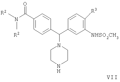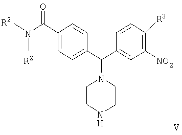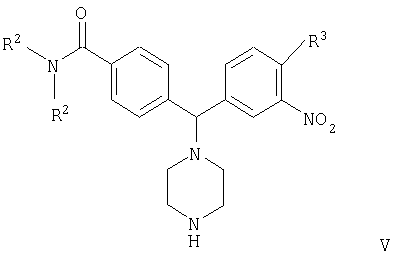 где R2 и R3 являются такими, как определено в п.1, a R4 представляет собой NO2, подвергают взаимодействию с SOBr2 в СН2Cl2 с последующим взаимодействием с Вос-пиперазином в ацетонитриле в присутствии триэтиламина в стандартных условиях, с последующим удалением защитной группы Вос в стандартных условиях с получением соединения формулы V