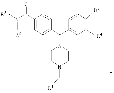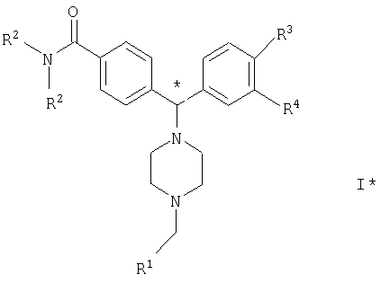 где каждое фенильное или гетероароматическое кольцо R1 может быть возможно и независимо дополнительно замещено 1, 2 или 3 заместителями, выбранными из CF3, метилом, хлоро, фторо, бромо и йодо; R2 независимо выбран из этила и изопропила; R3 независимо выбран из водорода и фторо; R4 независимо выбран из -NH2 и -NHSO2R5; R5 независимо представляет собой С1-С6алкил, или его соли или отдельные энантиомеры и их соли. 2. Соединение по п.1, где R1 представляет собой фенил, фуранил, тиенил или имидазолил; R2 представляет собой этил или изопропил; R3 представляет собой водород или фторо; R4 представляет собой -NH2 или -NHSO2R5; R5 представляет собой С1-С6алкил. 3. Соединение по п.1, где R1 представляет собой фенил, фуранил, тиенил или имидазолил; R2 представляет собой этил или изопропил; R3 представляет собой водород; R4 представляет собой -NHSO2R5; R5 представляет собой С1-С6алкил. 4. Соединение по п.1, где гетероароматическое(ие) кольцо(а) замещено(ы) CF3, метилом, йодо, бромо, фторо или хлоро. 5. Соединение по п.1, где гетероароматическое(ие) кольцо(а) замещено(ы) метилом. 6. Соединение по п.1, выбранное из любого из: 4-[1-(3-амино-фенил)-1-(4-бензил-пиперазин-1-ил)-метил]-N,N-диизопропил-бензамида; 4-[1-(3-амино-фенил)-1-(4-тиофен-3-илметил-пиперазин-1-ил)-метил]-N,N-диизопропил-бензамида; 4-{1-(3-амино-фенил)-1-[4-(1Н-имидазол-2-илметил)-пиперазин-1-ил]-метил}-N,N-диизопропил-бензамида; N,N-диизопропил-4-[1-(3-метансульфониламино-фенил)-1-(4-тиофен-3-илметил-пиперазин-1-ил)-метил]-бензамида; 4-([4-(3-фурилметил)-1-пиперазинил]{3-[метилсульфонил)амино]фенил}-N,N-диизопропил-бензамида; 4-{(3-аминофенил)[4-(3-тиенилметил)-1-пиперазинил]метил}-N,N-диэтилбензамида; 4-[(3-аминофенил)(4-бензил-1-пиперазинил)метил]-N,N-диэтилбензамида и 4-((4-бензил-1-пиперазинил){3-[(метилсульфонил)амино]фенил}метил)-N,N-диэтилбензамида. 7. Соединение по любому из пп.1-6 в форме его солей гидрохлорида, дигидрохлорида или дитрифторацетата. 8. Способ получения соединения формулы I, где R4 представляет собой -NH2, при котором соединение общей формулы