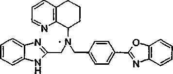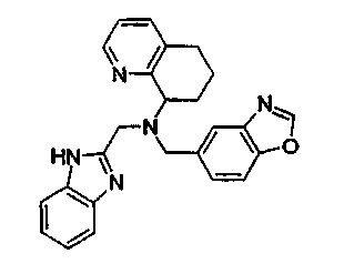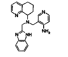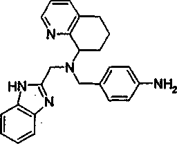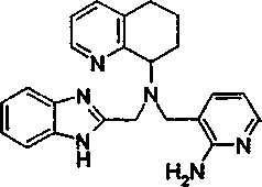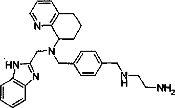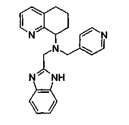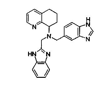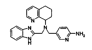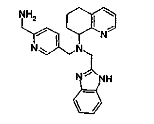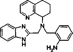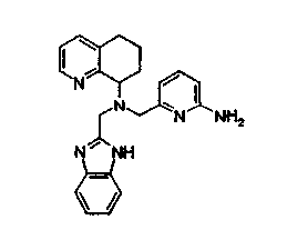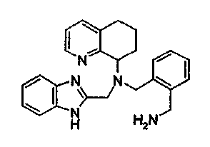 AMD9883: Получение (2-аминобензил)-(1Н-бензимидазол-2-илметил)-(5,6,7,8-тетрагидрохинолин-8-ил)амина. Используя общую методику N-алкилирования, раствор (5,6,7,8-тетрагидрохинолин-8-ил)-(2-аминобензил)амина (0,20 г, 0,8 ммоль), N,N-диизопропилэтиламина (0,14 мл, 0,8 ммоль) и иодида калия (5 мг, 30 ммоль) в CH3CN (8 мл) подвергали взаимодействию с 1-(N-трет-бутоксикарбонил)-2-хлорметилбензимидазолом (0,145 г, 0,55 ммоль) при 70°C в течение 16 часов, получая после очистки радиальной хроматографией на силикагеле (MeOH/NH4OH/CH2Cl2; 1:1:98) моно N-алкилированный продукт (65 мг, 25%) в виде бледно-желтого твердого вещества. 1Н ЯМР (CDCl3) Раствор полученного выше вещества (65 мг, 0,13 ммоль) в смеси CH2Cl2/ТФУК (1:1, 1 мл) перемешивали в течение 0,5 часа и раствор концентрировали при пониженном давлении. Реакционную смесь распределяли между 15% водным NaOH (3 мл) и CH2Cl2 (5 мл), фазы разделяли и органический экстракт сушили (MgSO4), фильтровали, концентрировали и очищали радиальной хроматографией на силикагеле (МеОН/NH4OH/CH2Cl2; 1:1:150), получая AMD9883 (33 мг, 64%) в виде бледно-желтого твердого вещества. 1Н ЯМР (CDCl3) Пример:50