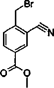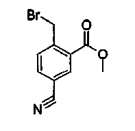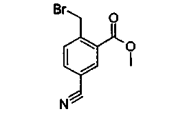 К перемешиваемой суспензии метилового эфира 5-амино-2-метилбензойной кислоты (1,00 г, 6,05 ммоль) в H2O (1,5 мл) медленно добавляли конц. HCl (1,5 мл) при комнатной температуре. Добавляли дополнительно H2O (7 мл) и смесь перемешивали при 0°C по мере добавления по каплям раствора NaNO2 (459 мг, 6,65 ммоль) в H2O (1 мл). После полного растворения амина медленно при 0°C добавляли К2СО3 (твердый) до нейтрализации раствора. Цианид меди(I) (651 мг, 7,27 ммоль) растворяли в растворе NaCN (712 мг, 14,5 ммоль) в H2O (2,2 мл) и раствор нагревали до 60°C. К интенсивно перемешиваемому раствору цианида при 60°C добавляли по каплям холодный раствор нейтрализованной соли диазония. Смесь нагревали до 110°C в течение 30 минут, затем оставляли охлаждаться до комнатной температуры. Смесь разбавляли насыщенным раствором NaHCO3 (водн.) (10 мл) и экстрагировали СН2Cl2 (4×12 мл). Объединенные органические экстракты сушили (MgSO4) и концентрировали в вакууме. Неочищенное вещество фильтровали через силикагель (10% EtOAc/гексаны), получая желтые кристаллы (896 мг, 85%). 1H ЯМР (CDCl3) Получение метилового эфира 2-бромметил-5-цианобензойной кислоты