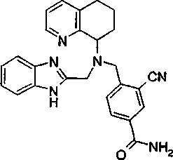 AMD11179: Получение 4-{[(1H-бензимидазол-2-илметил)-(5,6,7,8-тетрагидрохинолин-8-ил)амино]метил}-3-цианобензамида. К 0,5 мл никеля Ренея в воде добавляли раствор трет-бутилового эфира 2-{[(2-циано-4-метоксикарбонилбензил)-(5,6,7,8-тетрагидрохинолин-8-ил)амино]метил}бензимидазол-1-карбоновой кислоты (0,55 г, 1 ммоль) в метаноле (25 мл). Раствор затем насыщали газообразным аммиаком в течение 10 минут. Реакционный сосуд затем интенсивно встряхивали в атмосфере водорода при 40 фн/кв.дюйм (276 кПа) в течение 16 часов. Смесь фильтровали через слой целита и фильтрат концентрировали при пониженном давлении. Неочищенный остаток очищали колоночной хроматографией (88:12 CH2Cl2:MeOH), получая амид (0,20 г, 36%). 1Н ЯМР (CDCl3) Пример: 72