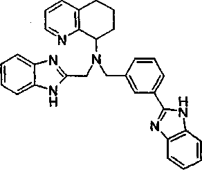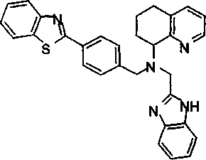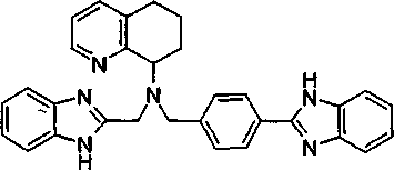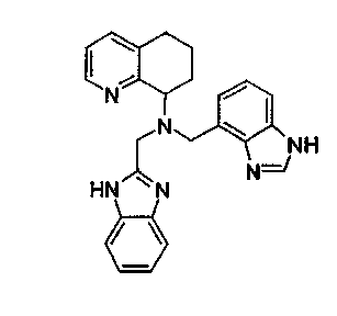AMD9872: Получение (1Н-бензимидазол-2-илметил)-[2-(1Н-бензимидазол-2-илметил)аминобензил]-(5,6,7,8-тетрагидрохинолин-8-ил)амина. Получение (5,6,7,8-тетрагидрохинолин-8-ил)-(2-аминобензил)амина Используя общую методику B, к раствору 2-аминобензиламина (0,36 г, 2,9 ммоль) и 6,7-дигидро-5Н-хинолин-8-она (0,43 г, 2,9 ммоль) в CH2Cl2 (15 мл) добавляли NaBH(ОАс)3 (0,92 г, 4,4 ммоль) и смесь перемешивали при комнатной температуре в течение 64 часов. Очистка неочищенного вещества колоночной хроматографией на силикагеле (2% MeOH/CH2Cl2) давала (5,6,7,8-тетрагидрохинолин-8-ил)-(2-аминобензил)амин (0,39 г, 52%) в виде желтого масла. 1Н ЯМР (CDCl3) Используя общую методику N-алкилирования, раствор (5,6,7,8-тетрагидрохинолин-8-ил)-(2-аминобензил)амина (0,16 г, 0,6 ммоль), N,N-диизопропилэтиламина (0,32 мл, 1,8 ммоль) и иодида калия (10 мг, 40 ммоль) в CH3CN (6 мл) подвергали взаимодействию с 1-(N-трет-бутоксикарбонил)-2-хлорметилбензимидазолом (0,32 г, 1,2 ммоль) при 70°C в течение 16 часов, получая после очистки колоночной хроматографией на силикагеле (CH2Cl2/MeOH, 250:1) N-алкилированный продукт (0,16 г, 37%) в виде бледно-желтого твердого вещества. 1Н ЯМР (CDCl3) Раствор полученного выше вещества (0,17 г, 0,24 ммоль) в смеси CH2Cl2/ТФУК (1:1, 2 мл) перемешивали в течение 0,5 часа и раствор концентрировали при пониженном давлении. Реакционную смесь распределяли между 15% водным NaOH (5 мл) и СН2Cl2 (5 мл), фазы разделяли и органический экстракт сушили (MgSO4), фильтровали, концентрировали и очищали радиальной хроматографией на силикагеле (МеОН/NH4OH/CH2Cl2; 1:1:98), получая AMD9872 (48 мг, 40%) в виде бледно-желтого твердого вещества. 1H ЯМР (CDCl3) Пример: 49