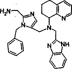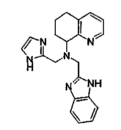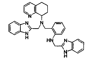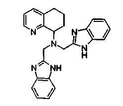 Используя методику S. Zimmerman et al. (S.C. Zimmerman, K.D. Cramer и A.A. Galan J. Org. Chem. 1989, 54, 1256-1264), N-бензилимидазол (15 г, 95 ммоль) обрабатывали формальдегидом (60 мл 37%-ного водного раствора), к которому добавляли ледяную уксусную кислоту (8 мл) и ацетат натрия (10,5 г). Полученную смесь перемешивали до гомогенности, затем переносили в толстостеннную стеклянную ампулу, которую запаивали и помещали при 140°C на масляную баню на 12 часов. Ампулу затем охлаждали, содержимое концентрировали, подщелачивали 10 н. NaOH и экстрагировали дважды смесью 10:1 изопропанол:хлороформ. Объединенные органические фракции затем сушили над безводным сульфатом натрия и концентрировали. Очистка хроматографией на силикагеле (7% метанол в дихлорметане) давала 2,5-бис(гидроксиметил)-N-бензилимидазол в виде белого кристаллического твердого вещества (4,9 г, 24%). 1H ЯМР (CDCl3) К раствору 2,5-бис-(гидроксиметил)-N-бензилимидазола (436 мг, 2,0 ммоль) в дихлорметане (10 мл) добавляли триэтиламин (0,35 мл, 2,0 ммоль) и уксусный ангидрид (0,19 мл, 2,0 ммоль). Смесь затем перемешивали в течение ночи (16 часов) при комнатной температуре. Реакционную смесь затем промывали водным раствором хлорида аммония и слои разделяли. Водный слой экстрагировали дважды дихлорметаном. Объединенные органические фракции затем сушили над безводным сульфатом натрия и концентрировали. Очистка хроматографией на силикагеле (5% метанол в дихлорметане) давала моноацетат, 2-ацетоксиметил-5-гидроксиметил-N-бензилимидазол, в виде белого порошка (300 мг, 58%). 1H ЯМР (CDCl3) К перемешиваемому раствору 2-ацетоксиметил-5-гидроксиметил-N-бензилимидазола (130 мг, 0,5 ммоль) в дихлорметане (5 мл) добавляли триэтиламин (0,104 мл, 0,75 ммоль) с последующим добавлением метансульфонилхлорида (0,046 мл, 0,6 ммоль). Полученный раствор перемешивали при комнатной температуре в течение 20 минут перед обработкой водным насыщенным раствором хлорида аммония (5 мл). Водный слой экстрагировали дважды дихлорметаном. Объединенные органические фракции затем сушили над безводным сульфатом натрия и концентрировали, получая целевой мезилат, который сразу же непосредственно использовали в следующей реакции без дополнительной очистки. 1H ЯМР (CDCl3) Используя общую методику N-алкилирования, O-метансульфонил-2-ацетоксиметил-5-гидроксиметил-N-бензилимидазол (0,5 ммоль) перемешивали при 60°C в ацетонитриле (5 мл) в течение 4 часов с диизопропилэтиламином (0,130 мл, 0,75 ммоль) и (1Н-N-трет-бутоксикарбонилбензимидазол-2-илметил)-(5,6,7,8-тетрагидрохинолин-8-ил)амином (226 мг, 0,6 ммоль). Реакционную смесь охлаждали и концентрировали. Остаток помещали в дихлорметан и экстрагировали водным хлоридом аммония, сушили, концентрировали и очищали хроматографией на силикагеле (20:1 дихлорметан:метанол), получая [N-(трет-бутоксикарбонил)бензимидазол-2-илметил]-(5,6,7,8-тетрагидрохинолин-8-ил)-[(2-ацетоксиметил-N-бензилимидазол-5-ил)метил]амин вместе с продуктом, образующимся при отщеплении ацетатной группы (смесь 138 мг). Смесь полученных выше продуктов (138 мг) обрабатывали карбонатом калия (100 мг) в метаноле (5 мл) и суспензию перемешивали в течение 8 часов при комнатной температуре. Смесь затем фильтровали и концентрировали, остаток очищали флэш-хроматографией на силикагеле с использованием смеси 20:1 дихлорметан:метанол в качестве элюента, получая [1Н-бензимидазол-2-илметил]-(5,6,7,8-тетрагидрохинолин-8-ил)-[(2-гидроксиметил-N-бензилимидазол-5-ил)метил]а