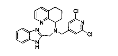 AMD9902: Получение (1Н-бензимидазол-2-илметил)-(5,6,7,8-тетрагидрохинолин-8-ил)-(имидазол-2-ил)метиламина (гидробромидная соль). Используя стандартные условия восстановительного аминирования A, 1Н-(бензимидазол-2-илметил)-(5,6,7,8-тетрагидрохинолин-8-ил)амин (207 мг, 0,75 ммоль) перемешивали с имидазол-2-карбоксальдегидом (96 мг, 1,0 ммоль) и цианоборгидридом натрия (95 мг, 1,5 ммоль) в метаноле (5 мл) в течение 48 часов. Раствор затем концентрировали. Остаток помещали в дихлорметан и промывали 1н. гидроксидом натрия (3 мл), затем сушили над безводным сульфатом натрия, концентрировали и очищали хроматографией на силикагеле (20:1 дихлорметан:метанол), получая (1Н-бензимидазол-2-илметил)-(5,6,7,8-тетрагидрохинолин-8-ил)-(имидазол-2-ил)метиламин (69 мг, 56%). 1Н ЯМР (CDCl3) (1Н-бензимидазол-2-илметил)-(5,6,7,8-тетрагидрохинолин-8-ил)-(имидазол-2-ил)метиламин (56 мг, 0,156 ммоль) помещали в уксусную кислоту (1 мл), к которой добавляли насыщенный раствор HBr в уксусной кислоте (1 мл). Смесь затем перемешивали, осаждали и выделяли по методике D, получая AMD9902 в виде белого кристаллического твердого вещества (39 мг). 1Н ЯМР (D2О) Пример: 74 AMD9592: Получение 4-{[(1Н-бензимидазол-2-илметил)-(5,6,7,8-тетрагидрохинолин-8-ил)амино]метил}-2,6-дихлорпиридина (гидробромидная соль). Получение 2,6-дихлорпиридин-4-илметилового эфира метансульфоновой кислоты К перемешиваемому раствору 2,6-дихлоризоникотиновой кислоты (280 мг, 1,5 ммоль) в ТГФ (7,5 мл) добавляли по каплям раствор BH3-ТГФ (1М в ТГФ, 5,8 мл, 5,8 ммоль) и смесь перемешивали при кипячении с обратным холодильником 65 часов. Реакционную смесь охлаждали, гасили MeOH (10 мл) и концентрировали при пониженном давлении. К полученному остатку добавляли MeOH (10 мл) и раствор повторно концентрировали. Данную процедуру повторяли пять раз и полученное белое твердое вещество (230 мг, 89%) использовали без дополнительной очистки в следующей стадии. Используя общую методику С, к перемешиваемому охлаждаемому льдом раствору полученного выше вещества (230 мг, 1,3 ммоль) и триэтиламина (0,50 мл, 3,9 ммоль) в CH2Cl2 (13 мл) добавляли метансульфонилхлорид (0,10 мл, 0,3 ммоль) и смесь перемешивали в течение 30 минут при 0°C. Целевой неочищенный мезилат (340 мг) получали в виде бледно-желтого твердого вещества и использовали без дополнительной очистки на следующей стадии. Используя общую методику N-алкилирования, раствор полученного выше вещества (330 мг, 1,3 ммоль) и N,N-диизопропилэтиламина (0,45 мл, 2,6 ммоль) в CH3CN (13 мл) подвергали взаимодействию с (1-трет-бутоксикарбонил-1Н-бензимидазол-2-илметил)-(5,6,7,8-тетрагидрохинолин-8-ил)амином (470 мг, 1,2 ммоль) в течение ночи. Очистка неочищенного вещества флэш-хроматографией на силикагеле (3:1 EtOAc/гексаны) давала целевой амин (400 мг, 58%) в виде бледно-желтого твердого вещества. Используя общую методику D, превращение полученного выше вещества (264 мг, 0,49 ммоль) в гидробромидную соль с одновременным удалением N-трет-бутоксикарбонильной защитной группы давало AMD9592 (280 мг, 92%) в виде белого порошка. 1Н ЯМР (D2О) Пример: 75