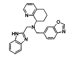 Смесь 5-метилбензоксазола (200 мг, 1,50 ммоль), N-бромсукцинимида (321 мг, 1,80 ммоль) и 2,2′-азобисизобутиронитрила (37 мг, 0,23 ммоль) в CCl4 (3 мл) кипятили с обратным холодильником в течение 22 часов. Смесь фильтровали и фильтрат концентрировали при пониженном давлении. Очистка неочищенного вещества на силикагеле (5% EtOAc/гексаны) давала указанное в заголовке соединение в виде бесцветных кристаллов (126 мг, 39%). 1Н ЯМР (CDCl3) Использование общего способа N-алкилирования, раствор 5-бромметилбензоксазола (94 мг, 0,44 ммоль), иодида калия (3 мг, 0,02 ммоль) и N,N-диизопропилэтиламина (0,10 мл, 0,57 ммоль) в CH3CN (4 мл) подвергали взаимодействию с (1-трет-бутоксикарбонил-1Н-бензимидазол-2-илметил)-(5,6,7,8-тетрагидрохинолин-8-ил)амином (152 мг, 0,402 ммоль) при 60°C в течение 22 часов. Очистка неочищенного вещества флэш-хроматографией на силикагеле (400:5:1 EtOAc/MeOH/NH4OH) давала желтую пену (124 мг, 60%). Раствор желтой пены (40 мг, 0,078 ммоль) в смеси 3:1 трифторуксусная кислота/CH2Cl2 (4 мл) перемешивали при комнатной температуре в течение 1 часа, затем концентрировали. Остаток распределяли между CH2Cl2 и насыщенным NaHCO3 (водн.) и водную фазу экстрагировали CH2Cl2. Объединенные органические фазы сушили (MgSO4), фильтровали и концентрировали, получая указанное в заголовке соединение в виде желтой пены (32 мг, 89%). 1Н ЯМР (CDCl3) Пример: 76