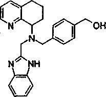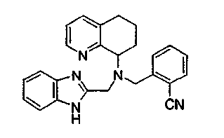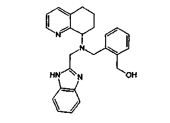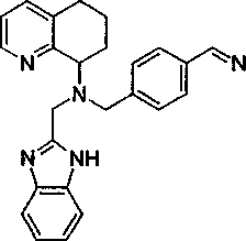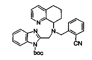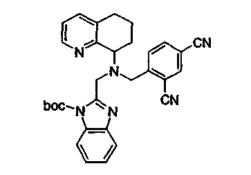 1,2-Дибромметан (0,016 мл, 0,19 ммоль) добавляли к суспензии цинковой пыли (288 мг, 4,41 ммоль) в ТГФ (1 мл) и смесь нагревали до 70°C в течение 10 минут. Смесь оставляли охлаждаться до комнатной температуры, добавляли TMSCl (триметилхлорсилан) (0,016 мл, 0,13 ммоль) и перемешивание продолжали при комнатной температуре в течение 30 минут. Смесь охлаждали до 0°C, раствор метил 4-(бромметил)бензоата (842 мг, 3,68 ммоль) в ТГФ (4 мл) добавляли в течение 2 часов и перемешивание продолжали при 0°C в течение 2 часов. Смесь охлаждали до -78°C, добавляли раствор тозилцианида (571 мг, 3,15 ммоль) в ТГФ (4 мл) и смесь перемешивали при комнатной температуре в течение 18 часов. Смесь концентрировали в вакууме и остаток распределяли между СН2Cl2 (20 мл) и насыщенным NaHCO3 (водн.) (20 мл). Водную фазу экстрагировали СН2Cl2 (3 × 10 мл), объединенные органические экстракты сушили (MgSO4) и концентрировали в вакууме. Очистка неочищенного вещества колоночной хроматографией на силикагеле (10% EtOAc/гексаны) давала бесцветные кристаллы (379 мг). Данное вещество было определено по данным 1H ЯМР как смесь метилового эфира 3-циано-4-метилбензойной кислоты и неидентифицированного побочного продукта и использовано на следующей стадии без дополнительной очистки. Смесь полученного выше нитрила (379 мг), NBS (400 мг, 2,25 ммоль) и AIBN (53 мг, 0,32 ммоль) в CCl4 (11 мл) кипятили с обратным холодильником в течение 4 дней, затем оставляли охлаждаться до комнатной температуры. Смесь фильтровали и фильтрат концентрировали в вакууме. Очистка неочищенного вещества колоночной хроматографией на силикагеле (5% EtOAc/гексаны) давала бесцветные кристаллы (100 мг, 12%). 1H ЯМР (CDCl3) Смесь трет-бутилового эфира 2-[(5,6,7,8-тетрагидрохинолин-8-иламино)метил]бензоимидазол-1-карбоновой кислоты (175 мг, 0,462 ммоль), метилового эфира 4-бромметил-3-цианобензойной кислоты (98 мг, 0,39 ммоль), иодида калия (4 мг, 0,02 ммоль) и N,N-диизопропилэтиламина (0,10 мл, 0,57 ммоль) в ацетонитриле (4,0 мл) нагревали при 60°C в течение 16 часов. Добавляли насыщенный NaHCO3 (водн.) (15 мл) и смесь экстрагировали CH2Cl2 (3×10 мл). Органические экстракты сушили (MgSO4) и концентрировали в вакууме. Очистка неочищенного вещества на силикагеле (500:5:1 CH2Cl2/МеОН/NH4ОН) давала желтое масло (213 мг, 100%). 1H ЯМР (CDCl3) Раствор трет-бутилового эфира 2-{[(2-циано-4-метоксикарбонилбензил)-(5,6,7,8-тетрагидрохинолин-8-ил)амино]метил}бензоимидазол-1-карбоновой кислоты (213 мг, 0,386 ммоль) в насыщенном NH3(г)/MeOH (10 мл) встряхивали при комнатной температуре с суспензией никеля Ренея (1,5 г) в атмосфере водорода (45 фн/дюйм2) в течение 17 часов. Катализатор удаляли фильтрованием и фильтрат концентрировали в вакууме, получая зеленую пену (195 мг). К раствору полученного выше неочищенного амина (195 мг) в ТГФ (4 мл) добавляли ди-трет-бутилдикарбонат (220 мг, 1,01 ммоль) и раствор перемешивали при комнатной температуре в течение 3 дней. Раствор концентрировали в вакууме и остаток фильтровали через силикагель (600:5:1 CH2Cl2/MeOH/NH4OH), получая желтую пену (130 мг). К раствору полученного выше неочищенного сложного эфира (130 мг) в ТГФ (2 мл) добавляли LiAlH4 (1,0 М/ТГФ, 0,20 мл, 0,20 ммоль) при 0°C и смесь перемешивали при 0°C в течение 15 минут. Добавляли метанол (1 мл), затем 10% HCl (водн.) (1 мл). Смесь подщелачивали с использованием насыщенного раствора NaHCO3 (водн.) (30 мл) затем экстрагировали СН2Cl2 (4 x 12 мл). Объединенные органические экстракты сушили (MgSO4) и концентрировали в вакууме, получая желтую пену (116 мг). Раствор полученного в