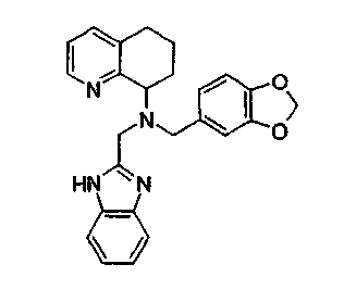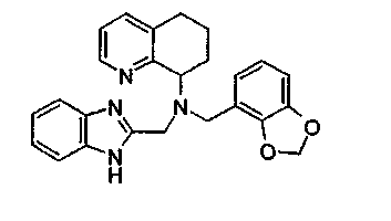 AMD9781: Получение (1Н-бензимидазол-2-илметил))-(бензо[1,3]диоксол-4-илметил)-(5,6,7,8-тетрагидрохинолин-8-ил)амина По общей методике B к раствору 2,3-(метилендиокси)бензальдегида (57 мг, 0,379 ммоль) и [1-(трет-бутоксикарбонил)-(1Н-бензимидазол-2-илметил)]-(5,6,7,8-тетрагидрохинолин-8-ил)амина (140 мг, 0,371 ммоль) в CH2Cl2 (5 мл) добавляли NaBH(OAc)3 (107 мг, 0,505 ммоль) и реакционную смесь перемешивали в течение ночи. Очистка полученного масла радиальной хроматографией на силикагеле (2мм ТСХ, 100:1:1 CH2Cl2:CH3OH:NH4OH) давала N-алкилированный амин (105 мг). Раствор этого амина в ТФУК (2 мл) перемешивали в течение 1 часа, затем концентрировали при пониженном давлении и полученное неочищенное вещество распределяли между CH2Cl2 (15 мл) и насыщенным водным раствором NaHCO3 (15 мл). Фазы разделяли и органический слой сушили (Na2SO4), фильтровали, концентрировали и очищали радиальной хроматографией (1 мм ТСХ пластина, 125:1:1 CH2Cl2:CH3OH:NH4OH), получая AMD9781 (45% по двум стадиям). 1Н ЯМР (CDCl3) Пример: 81
