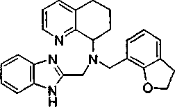 AMD9817: Получение (1Н-бензимидазол-2-илметил)-(2,3-дигидробензофуран-7-илметил)-(5,6,7,8-тетрагидрохинолин-8-ил)амина (гидробромидная соль). По общей методике B к раствору 2,3-дигидробензофуран-7-карбоксальдегида (53,6 мг, 0,362 ммоль) и [1-(трет-бутоксикарбонил)-(1Н-бензимидазол-2-илметил)]-(5,6,7,8-тетрагидрохинолин-8-ил)амина (136 мг, 0,361 ммоль) CH2Cl2 (5 мл) добавляли NaBH(OAc)3 (112 мг, 0,528 ммоль) и смесь перемешивали в течение ночи. Очистка неочищенного продукта радиальной хроматографией на силикагеле (1 мм ТСХ пластина, 125:1:1 CH2Cl2: CH3OH:NH4OH) давала целевое свободное основание (48 мг, 33 %). По общей методике D превращение полученного выше амина (28 мг, 38 %) давало AMD9817. 1Н ЯМР (D2О) Пример: 83