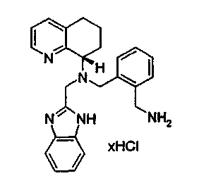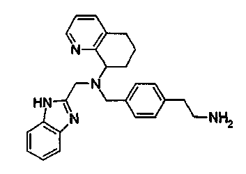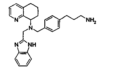 Получение 3-(4-хлорметилфенил)-пропионитрила Ацетонитрил (0,30 мл, 5,7 ммоль) добавляли к раствору н-бутиллития (2,4М в гексанах, 1,96 мл, 4,7 ммоль) в безводном ТГФ (5 мл) при -78°C и перемешивали в течение 45 минут, добавляли раствор Используя общую методику алкилирования С, к перемешиваемому раствору 3-(4-хлорметилфенил)пропионитрила (63 мг, 0,35 ммоль) и (1-трет-бутоксикарбонил-1Н-бензимидазол-2-илметил)-(5,6,7,8-тетрагидрохинолин-8-ил)амина (121 мг, 0,32 ммоль) в безводном CH3CN (3 мл) добавляли KI (2,6 мг, 0,016 ммоль) и N,N-диизопропилэтиламин (0,08 мл, 0,48 ммоль) и смесь нагревали при 60°C в течение 24 часов. Продукт очищали колоночной хроматографией на силикагеле (200:1:1 CH2Cl2:MeOH:NH4OH), получая целевой продукт конденсации (128 мг, 77%) в виде желтого сиропа. 1H ЯМР (300 МГц, CDCl3) Раствор трет-бутилового эфира 2-{[[4-(2-цианоэтил)бензил]-(5,6,7,8-тетрагидрохинолин-8-ил)амино]метил}бензоимидазол-1-карбоновой кислоты (128 мг, 0,24 ммоль) в MeOH (10 мл) насыщали NH3(г). Никель Ренея (2 г, избыток) промывали MeOH (3x), переносили в колбу для гидрирования, содержащую нитрил, и смесь гидрировали при давлении 45 фн/дюйм2 (310 кПа) в течение 16 часов. Смесь продуктов разбавляли MeOH (100 мл) и фильтровали через целит и растворитель из элюента удаляли в вакууме. Продукт очищали колоночной хроматографией на силикагеле (100:1:1 CH2Cl2:MeOH:NH4OH), получая целевой амин (51 мг, 50%) в виде белой пены. 1H ЯМР (300 МГц, CDCl3) По общей методике D превращение полученной выше пены (51 мг) в гидробромидную соль давало AMD9756. 1H ЯМР (300 МГц, D2О) Пример: 11