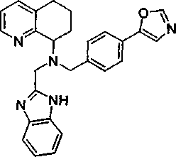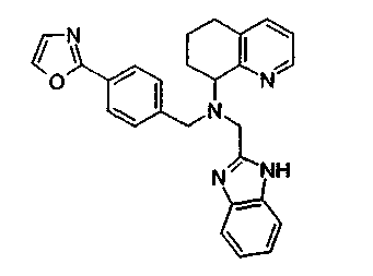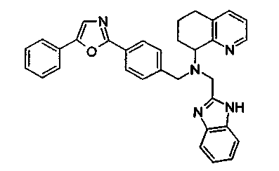 AMD9715: Получение (1Н-бензимидазол-2-илметил)-[4-(5-фенилоксазол-2-ил)бензил]-(5,6,7,8-тетрагидрохинолин-8-ил)амина. Получение метил-N-(2-оксо-2-фенилэтил)терефталамата К раствору 2-аминоацетофенона (516 мг, 3,0 ммоль) и триэтиламина (0,84 мл, 6 ммоль) в CH2Cl2 (20 мл) при 0°C добавляли по каплям в течение 10 минут метил 4-хлоркарбонилбензоат (594 мг, 3,0 ммоль). Затем раствор оставляли нагреваться до комнатной температуры и перемешивали в течение 90 минут. Раствор промывали насыщенным водным раствором NH4Cl (20 мл) и водный слой экстрагировали в CH2Cl2 (2 × 10 мл). Объединенные органические экстракты сушили (Na2SO4), фильтровали и концентрировали в вакууме, получая целевой метил N-(2-оксо-2-фенилэтил)терефталамат в виде бледно-желтых кристаллов (835 мг, 94%). 1Н ЯМР (CDCl3) Получение метил 4-(5-фенилоксазол-2-ил)бензоата (как описано Wipf, P., Miller, C.P. J. Org. Chem. 1993, 58, 3604): К раствору трифенилфосфина (524 мг, 2,0 ммоль) и триэтиламина (0,56 мл, 4,0 ммоль) в СН2Cl2 (10 мл) добавляли иод (480 мг, 1,9 ммоль) и смесь перемешивали в течение 15 минут. Добавляли раствор метил N-(2-оксо-2-фенилэтил)терефталамата (297 мг, 1,0 ммоль) в CH2Cl2 (5 мл) и полученную смесь перемешивали при комнатной температуре в течение ночи. Органическую фазу промывали 5%-ным водным раствором тиосульфата натрия (1 × 15 мл) и насыщенным раствором NaHCO3 (1 x 15 мл) и затем сушили (Na2SO4), фильтровали и концентрировали в вакууме. Полученный маслянистый остаток очищали колоночной хроматографией на силикагеле (1:1 гексаны/EtOAc), получая целевой продукт, метил 4-(5-фенилоксазол-2-ил)бензоат, в виде желтого масла (69 мг, 24%). 1Н ЯМР (CDCl3) К раствору метил-4-(5-фенилоксазол-2-ил)бензоата (56 мг, 0,19 ммоль) в CH2Cl2 (8 мл) при -78°C добавляли DIBAL-H (1 мл 1,0 M раствора в CH2С12, 1,0 ммоль) и раствор перемешивали при -78°C в течение 90 минут. К реакционной смеси добавляли насыщенный водный раствор тартрата натрия-калия (5 мл) и смесь оставляли нагреваться до комнатной температуры. Двухфазную систему интенсивно перемешивали в течение 60 минут, слои разделяли и водный слой экстрагировали CH2Cl2 (2 × 10 мл). Объединенные органические фракции сушили (Na2SO4), фильтровали и концентрировали в вакууме, получая целевой спирт, 2-(4-гидроксиметилфенил)-5-фенилоксазол, в виде бледно-желтого масла (46 мг, 96%). 1Н ЯМР (CDCl3) По общей методике С к раствору полученного выше спирта (123 мг, 0,5 ммоль) и триэтиламина (0,105 мл, 0,75 ммоль) в CH2Cl2 (8 мл) добавляли метансульфонилхлорид (0,05 мл, 0,65 ммоль) и смесь перемешивали при комнатной температуре в течение 10 минут. Целевой неочищенный 2-(4-(метансульфонатометилфенил))-5-фенилоксазол получали в виде бледно-желтого масла и использовали непосредственно без дополнительной очистки в следующей реакции. По общей методике алкилирования к раствору полученного выше мезилата (0,5 ммоль) и (1-трет-бутоксикарбонил-1Н-бензимидазол-2-илметил)-(5,6,7,8-тетрагидрохинолин-8-ил)амина (264 мг, 0,7 ммоль) в СН3CN (8 мл) добавляли N,N-диизопропилэтиламин (0,145 мл, 0,8 ммоль) и иодид калия (8 мг, 0,05 ммоль) и полученную смесь нагревали при 60°C в течение ночи. Неочищенный остаток очищали колоночной хроматографией на силикагеле (CH2Cl2/MeOH, 95:5), получая целевой третичный амин, (1Н-1-трет-бутоксикарбонилбензимидазол-2-илметил)-[4-(5-фенилоксазол-2-ил)бензил]-(5,6,7,8-тетрагидрохинолин-8-ил)амин, в виде бледно-желтой пены (209 мг, 68%). 1Н ЯМР (CDCl3) Используя общую методику D, превращение полученной выше пены (31 мг, 0,05 ммоль) в гидробромидную соль с последующим переосаждением промежуточного 