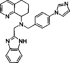 AMD9755: Получение (1Н-бензимидазол-2-илметил)-(4-имидазол-1-илбензил)-(5,6,7,8-тетрагидрохинолин-8-ил)амина (гидробромидная соль). Используя общую методику B, взаимодействие 4-(имидазол-1-ил)бензальдегида (0,075 г, 0,44 ммоль) и (1-трет-бутоксикарбонил-1Н-бензимидазол-2-илметил)-(5,6,7,8-тетрагидрохинолин-8-ил)амина (0,107 г, 0,29 ммоль) с NaBH(OAc)3 (0,171 г, 0,81 ммоль) в CH2Cl2 (3 мл) в течение 24 часов с последующей очисткой неочищенного вещества колоночной хроматографией на силикагеле (25:1:1 CH2Cl2-CH3OH-NH4OH) давало 0,091 г (58%) целевого третичного амина в виде белого твердого вещества. Используя общую методику D, превращение белого твердого вещества (91 мг) в гидробромидную соль с одновременным удалением BOC-защитной группы с последующим переосаждением промежуточного твердого вещества из смеси метанол/эфир давало AMD9755 (89 мг) в виде белого твердого вещества. 1Н ЯМР (D2О) Пример: 91