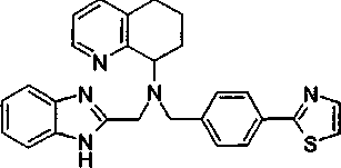 AMD9757: Получение [4-(тиазол-2-ил)бензил]-(1Н-бензимидазол-2-илметил)-(5,6,7,8-тетрагидрохинолин-8-ил)амина (гидробромидная соль). Получение 4-(2-тиазолил)бензальдегида К раствору 2-бромтиазола (0,26 г, 1,6 ммоль) и 4-формилфенилбороновой кислоты (0,48 г, 3,2 ммоль) в толуоле (16 мл) добавляли тетракис(трифенилфосфин)палладий(0) (0,09 г, 0,08 ммоль) и K2CO3 (0,33 г, 2,4 ммоль) и раствор перемешивали при кипячении с обратным холодильником в течение 16 часов. Реакционную смесь охлаждали до комнатной температуры, разбавляли водой (50 мл) и этилацетатом (50 мл). Органический слой отделяли, промывали насыщенным раствором соли (30 мл), сушили (MgSO4), фильтровали, концентрировали и очищали колоночной хроматографией на силикагеле (2% MeOH/CH2Cl2), получая 4-(2-тиазолил)бензальдегид (45 мг, 15%). 1Н ЯМР (CDCl3) Используя общую методику B, к раствору 4-(2-тиазолил)бензальдегида (45 мг, 0,24 ммоль) и (1-трет-бутоксикарбонил-1Н-бензимидазол-2-илметил)-(5,6,7,8-тетрагидрохинолин-8-ил)амина (81 мг, 0,21 ммоль) в дихлорметане (2,5 мл) добавляли NaBH(OAc)3 (77 мг, 0,36 ммоль) и смесь перемешивали при комнатной температуре в течение 16 часов. Очистка неочищенного вещества радиальной хроматографией на силикагеле (MeOH/NH4ОН/CH2Cl2, 1:1:98) давала целевой амин (34 мг, 28%) в виде хлопьевидного белого твердого вещества. 1Н ЯМР (CDCl3) Используя общую методику D, превращение полученного выше твердого вещества (34 мг) в гидробромидную соль давало AMD9757 (34 мг) в виде белого твердого вещества. 1Н ЯМР (D2О) Пример: 92