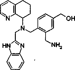 Смесь метилового эфира 5-циано-2-метилбензойной кислоты (894 мг, 5,10 ммоль), NBS (1,00 г, 5,62 ммоль) и AIBN (125 мг, 0,761 ммоль) в CCl4 (20 мл) кипятили с обратным холодильником в течение 3 дней, затем оставляли охлаждаться до комнатной температуры. Смесь фильтровали и фильтрат концентрировали в вакууме. Очистка неочищенного вещества колоночной хроматографией на силикагеле (5% EtOAc/гексаны) давала желтые кристаллы (800 мг, 62%). 1H ЯМР (CDCl3) Смесь трет-бутилового эфира 2-[(5,6,7,8-тетрагидрохинолин-8-иламино)метил]бензоимидазол-1-карбоновой кислоты (253 мг, 0,668 ммоль), метилового эфира 2-бромметил-5-цианобензойной кислоты (170 мг, 0,669 ммоль), иодида калия (6 мг, 0,04 ммоль) и N,N-диизопропилэтиламина (0,17 мл, 0,98 ммоль) в ацетонитриле (6,7 мл) нагревали при 60°C в течение 18 часов. Добавляли насыщенный раствор NaHCO3 (водн.) (15 мл) и смесь экстрагировали СН2Cl2 (3 × 15 мл). Органические экстракты сушили (MgSO4) и концентрировали в вакууме. Очистка неочищенного вещества на силикагеле (500:5:1 CH2Cl2/MeOH/NH4OH) давала желтую пену (360 мг, 98%). 1H ЯМР (CDCl3) Раствор трет-бутилового эфира 2-{[(4-циано-2-метоксикарбонилбензил)-(5,6,7,8-тетрагидрохинолин-8-ил)амино]метил}бензоимидазол-1-карбоновой кислоты (356 мг, 0,645 ммоль) в насыщенном NH3(г)/MeOH (20 мл) встряхивали при комнатной температуре с суспензией никеля Ренея (1,5 г) в атмосфере водорода при давлении 45 фн/дюйм2 (310 кПа) в течение 20 часов. Катализатор удаляли фильтрованием и фильтрат концентрировали в вакууме. Неочищенное вещество фильтровали через силикагель (100:5:1 CH2Cl2/MeOH/NH4OH), получая желтое масло (203 мг, 69%). 1H ЯМР (CDCl3) К раствору метилового эфира 5-аминометил-2-{[(1Н-бензоимидазол-2-илметил)-(5,6,7,8-тетрагидрохинолин-8-ил)амино]метил}бензойной кислоты (192 мг, 0,421 ммоль) в ТГФ (4,2 мл) добавляли LiAlH4 (1,0 М/ТГФ, 0,42 мл, 0,42 ммоль) при 0°C и смесь перемешивали при 0°C в течение 15 минут. К смеси добавляли H2O (0,016 мл), затем 15% NaOH (водн.) (0,016 мл) и H2О (0,048 мл). Смесь оставляли нагреваться до комнатной температуры, затем фильтровали и концентрировали в вакууме. Очистка неочищенного вещества колоночной хроматографией на силикагеле (100:5:1 CH2Cl2/MeOH/NH4OH) давала AMD11088 в виде бесцветной пены (29 мг, 15%). 1H ЯМР (CDCl3) Пример: 13