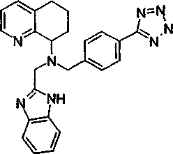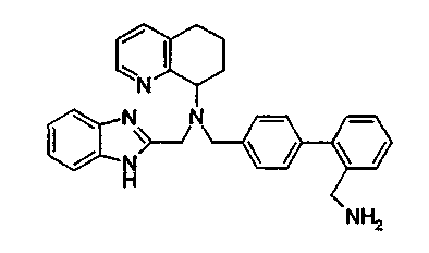 AMD 9841 Получение (2′-аминометилбифенил-4-илметил)-(1Н-бензимидазол-2-илметил)-(5,6,7,8-тетрагидрохинолин-8-ил)амина (гидробромидная соль) Используя общую методику алкилирования, к раствору (1-трет-бутоксикарбонил-1Н-бензимидазол-2-илметил)-(5,6,7,8-тетрагидрохинолин-8-ил)амина (0,194 г, 0,51 ммоль) в CH3CN (5 мл) добавляли N,N-диизопропилэтиламин (0,30 мл, 1,72 ммоль), затем 4′-бромметил-2-цианобифенил (0,303 г, 1,11 ммоль) и полученную смесь нагревали при 60°C в течение 25 часов. Очистка неочищенного вещества колоночной хроматографией на силикагеле (10:1:1 СН2Cl2-СН3ОН-NH4OH) с последующей радиальной хроматографией на силикагеле (2 мм пластина, 100:1:1 СН2Cl2-СН3ОН-NH4ОН) давала желто-коричневую пену (79 мг). Полученное выше промежуточное соединение (79 мг, 0,14 ммоль) растворяли в насыщенном NH3 метаноле (3 мл) в аппарате Парра для гидрирования. Никель Ренея (50 мг) промывали MeOH (3x), переносили в колбу для гидрирования, содержащую нитрил, и смесь гидрировали при давлении 50 фн/дюйм2 (345 кПа) в течение 24 часов. Смесь фильтровали через целит и осадок на фильтре промывали метанолом. Элюент концентрировали при пониженном давлении. Очистка неочищенного вещества радиальной хроматографией на силикагеле (1 мм пластина, 50:1:1 СН2Cl2-СН3ОН-NH4ОН) давала 36 мг (54%) свободного основания указанного в заголовке соединения в виде белой пены. Используя общую методику D, превращение белой пены (36 мг) в гидробромидную соль, с последующим переосаждением промежуточного твердого вещества из смеси метанол/эфир, давало AMD9841 (35 мг) в виде белого твердого вещества. 1Н ЯМР (D2О) Пример: 96