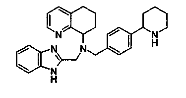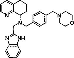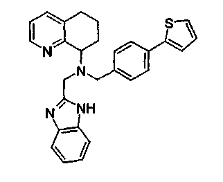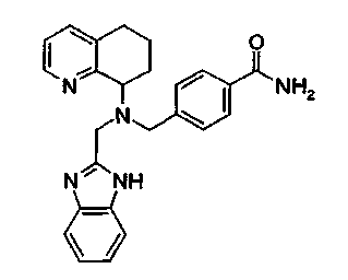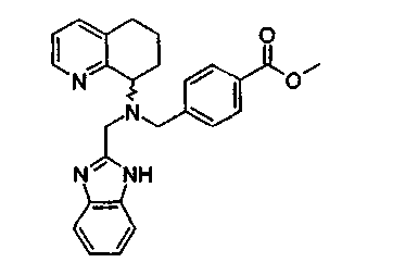AMD9711: Получение метилового эфира 4-{[(1Н-бензимидазол-2-илметил)-(5,6,7,8-тетрагидрохинолин-8-ил)амино]метил}бензойной кислоты. По общему способу B к раствору (1-трет-бутоксикарбонил-1Н-бензимидазол-2-илметил)-(5,6,7,8-тетрагидрохинолин-8-ил)амина (680 мг, 1,8 ммоль) и метил 4-формилбензоата (295 мг, 1,8 ммоль) в СН2Cl2 (10 мл) добавляли NaBH(OAc)3 (763 мг, 3,6 ммоль) и смесь перемешивали в течение 18 часов. Полученное неочищенное вещество помещали в неразбавленную ТФУК (2 мл) и перемешивали 3 часа. Осторожно добавляли насыщенный водный раствор бикарбоната натрия (10 мл), полученную смесь экстрагировали СН2Cl2 (3 × 20 мл), объединенные органические экстракты сушили (MgSO4) и концентрировали в вакууме. Очистка неочищенного вещества флэш-хроматографией (силикагель, 50:2:1 CH2Cl2/MeOH/NH4OH) давала указанное в заголовке соединение (565 мг, 74%) в виде белого твердого вещества. 1Н ЯМР (CDCl3) Пример: 62