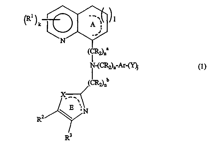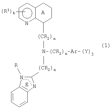 и его соли, R1 представляет Н; k равно 3; Ar представляет фрагмент, содержащий 5-6-членную моноциклическую или 9-12-членную конденсированную ароматическую или гетероароматическую систему, включающую атомы N или О, или их комбинацию; каждый n независимо равен 0-2; j равен 0-3; каждый Y независимо выбран из группы, состоящей из галогена, OR; -(CR2)mCN; -(CR2)mNR5 2; -(CR2)mNR(CR2)mNRR4; -(CR2)mNR(CR2)mNR(CR2)mNR5 2; -(CR2)mCO(CR2)mNR5 2; -(CR2)mCO(CR2)mNR(CR2)mNRR4; -(CR2)mCO(CR2)mNR(CR2)mNR(CR2)mNR5 2; -(CR2)mNRCO(CR2)mNRR4; -(CR2)mNRCO(CR2)mNR(CR2)mNR5 2; -(CR2)mNRCO(CR2)mNR(CR2)mNR(CR2)mNR(CR2)mNR5 2; -(CR2)mNROH; -(CR2)mCONROH; -(CR2)mCR=NOH; -NR(CR2)mZ; -гуанидино; -NHNHR; -CH=N-Z; и -амидино; где каждый R независимо представляет Н или алкил(1-6С), при условии, что R представляет Н, когда присутствует в группах -(CR2)- или когда присоединен к атому азота в кольце Е; каждый m независимо равен 0-4, каждый R4 и каждый R5 независимо представляет Н, алкил(1-6С) или алкенил(2-6С), каждый из которых необязательно замещен одним или более неароматическим(и), негетероциклическим(и) заместителем(ями), где два R5 могут быть объединены с образованием циклического амина, необязательно содержащего один или более дополнительных гетероатомов, выбранных из N, О и S; и Z представляет ароматический или гетероароматический заместитель, содержащий 5-12 членов цикла и в качестве гетероатомов содержащий N, О и/или S. 2. Соединение по п.1, где (CR2)n между кольцом А и N представляет связь. 3. Соединение по п.1, где (CR2)n между кольцом Е и N представляет СН2. 4. Соединение по п.1, где по крайней мере один Y представляет -(CH2)mNR5 2. 5. Соединение по п.1, где Ar представляет остаток бензола, пиридина, бензимидазола, оксазола, бензоксазола, имидазола, бензо[1,3-диоксола] и 2,3-дигидробензофурана. 6. Соединение по п.5, где Ar представляет остаток бензола, бензимидазола, имидазола, оксазола и пиридина. 7. Фармацевтическая композиция для модулирования активности хемокинового рецептора, включающая терапевтически эффективное количество соединения по любому из пп.1-6. 8. Применение соединения по любому из пп.1-6 для лечения состояния, опосредованного хемокиновым рецептором. 9. Применение соединения по любому из пп.1-6 для лечения вируса иммунодефицита человека или вируса иммунодефицита кошачьих. 10. Применение соединения по п.8, где хемокиновым рецептором является CXCR4 или CCR5. 11. Соединение, выбранное из группы, состоящей из: (3-аминометил-4-{[(1Н-бензоимидазол-2-илметил)-(5,6,7,8-тетрагидрохинолин-8-ил)амино]метил}фенил)метанола; (1H-бензимидазол-2-илметил)-(5,6,7,8-тетрагидрохинолин-8-ил)-[(1-бензил-2-аминометил)имидазол-5-илметил)]амина; (5-аминометил-2-{[(1H-бензоимидазол-2-илметил)-(5,6,7,8-тетрагидрохинолин-8-ил)амино]метил}фенил)метанола; метилового эфира 5-аминометил-2-{[(1Н-бензоимидазол-2-илметил)-(5,6,7,8-тетрагидрохинолин-8-ил)амино]метил}бензойной кислоты; 3-аминометил-4-{[(1Н-бензимидазол-2-илметил)-(5,6,7,8-тетрагидрохинолин-8-ил)амино]метил}бенэойной кислоты; метилового эфира 3-аминометил-4-{[(1Н-бензимидазол-2-илметил)-(5,6,7,8-тетрагидрохинолин-8-ил)амино]метил}бензойной кислоты; (2-аминометил-4-метоксиметилбензил)-(1Н-бензимидазол-2илметил)-(5,6,7,8-тетрагидрохинолин-8-ил)амина; N-(2-{[(1Н-бензимидазол-2-илметил)-(5,6,7,8-тетрагидрохинолин-8-ил)амино]метил}бензил)гуанидина; N-(4-{[(1Н-бензимидазол-2-илметил)-(5,6,7,8-тетрагидрохинолин-8-ил)амино]метил}бензил)гуанидина (гидробромидной соли); N’-(4-{[(1Н-бензимидазол-2-илметил)-(5,6,7,8-тетрагидрохинолин-8-ил)амино]метил}бензил)-N,N-диметилгуанидина; [4-(1Н-бензимидазол-2-илметил)-(5,6,7,8-тетрагидрохино
