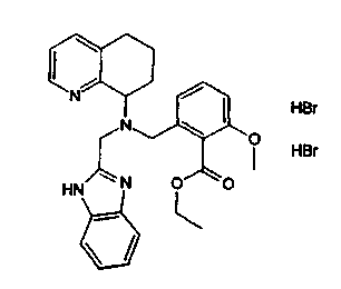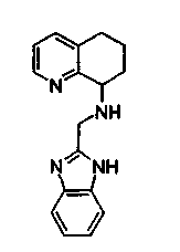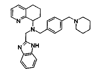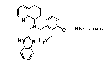AMD9716: Получение [4-(1Н-имидазол-2-ил)бензил]-(1Н-бензимидазол-2-илметил)-(5,6,7,8-тетрагидрохинолин-8-ил)амина (гидробромидная соль). Получение метил [(диметиламид N-сульфоновой кислоты)имидазол-2-ил]бензилового спирта К раствору диметиламида имидазол-1-сульфоновой кислоты (1,03 г, 5,9 ммоль) в ТГФ (5,9 мл) при -78°C добавляли н-бутиллитий (3,2 мл, 2,42 M в ТГФ) и раствор перемешивали при -78°C в течение 15 минут. К смеси добавляли раствор хлорида цинка (0,80 г, 5,9 ммоль) в ТГФ (4,4 мл) при -78°C, реакционную смесь нагревали до комнатной температуры и перемешивали в течение 0,5 часа. К полученной смеси добавляли тетракис(трифенилфосфин)палладий(0) (0,27 г, 0,2 ммоль), раствор метил 4-бромбензоата (0,85 г, 3,9 ммоль) в ТГФ (2,6 мл) и хлорид цинка (1,6 г, 11,8 ммоль) и реакционную смесь кипятили с обратным холодильником в течение 6 часов. Реакционную смесь гасили насыщенным раствором NH4Cl (50 мл), слои разделяли и органический слой промывали насыщенным раствором соли (1 × 30 мл), сушили (MgSO4), фильтровали, концентрировали и очищали колоночной хроматографией на силикагеле (2% MeOH/CH2Cl2), получая метил [(диметиламид N-сульфоновой кислоты)имидазол-2-ил]бензоат (0,56 г, 47%) в виде коричневого твердого вещества. 1Н ЯМР (CDCl3) К раствору метил [(диметиламид N-сульфоновой кислоты)имидазол-2-ил]бензоата (0,56 г, 1,8 ммоль) в ТГФ (18 мл) при -78°C добавляли раствор DIBAL- H (9,1 мл, 1,0 M в ТГФ). Реакционную смесь оставляли нагреваться до комнатной температуры, перемешивали в течение 1 часа и гасили насыщенным раствором тартрата калия-натрия (25 мл). Двухфазную систему интенсивно перемешивали в течение 1 часа, фазы разделяли и органический слой сушили (MgSO4), фильтровали и концентрировали, получая метил [(диметиламид N-сульфоновой кислоты)имидазол-2-ил]бензиловый спирт (0,39 г, 76%). 1Н ЯМР (CDCl3) Используя общую методику С, к раствору полученного выше спирта (0,39 г, 1,4 ммоль) и триэтиламина (0,30 мл, 2,1 ммоль) в ТГФ (14 мл) добавляли метансульфонилхлорид (0,15 мл, 1,9 ммоль) и смесь перемешивали при комнатной температуре в течение 1 часа. Полученный мезилат (0,50 г) использовали без дополнительной очистки в следующей реакции. 1Н ЯМР (CDCl3) Используя общую методику алкилирования, раствор полученного выше мезилата (0,29 г, 0,8 ммоль), N,N-диизопропилэтиламина (0,21 мл, 1,2 ммоль) и иодида калия (10 мг, 40 ммоль) в CH3CN (9 мл) подвергали взаимодействию с (1-трет-бутоксикарбонил-1Н-бензимидазол-2-илметил)-(5,6,7,8-тетрагидрохинолин-8-ил)амином (0,31 г, 0,8 ммоль) при 60°C в течение 16 часов. Очистка неочищенного колоночной хроматографией на силикагеле (6% MeOH/CH2Cl2) давала целевой амин (0,25 г, 48%) в виде хлопьевидного белого твердого вещества. 1Н ЯМР (CDCl3) Раствор полученного выше защищенного имидазолиламина (0,25 г, 0,5 ммоль) в 2M HCl (4 мл) кипятили с обратным холодильником в течение 16 часов. Смесь разбавляли 15%-ным водным NaOH (20 мл) и экстрагировали CH2Cl2 (2 × 20 мл). Органический слой отделяли, сушили (MgSO4), фильтровали, концентрировали и очищали колоночной хроматографией на силикагеле (5% MeOH/CH2Cl2), получая целевой амин (0,10 г, 60%) в виде белого твердого вещества. 1Н ЯМР (CDCl3) Используя общую методику D, превращение твердого вещества полученного выше (100 мг) в гидробромидную соль давало AMD9716 (0,125 г) в виде белого твердого вещества. 1Н ЯМР (D2О) Пример: 95
