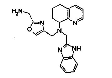 Используя методику P. Wipf и др. (A.J. Phillips, Y. Uto, P. Wipf, М. J. Reno и D.R. Williams, Org. Lett. 2000, 2(8), 1165-1168), охлажденный до -20°C раствор N-(трет-бутоксикарбонил)-Gly-Ser-OMe (170 мг, 0,615 ммоль) в дихлорметане (5 мл) обрабатывали трифторидом бис(2-метоксиэтил)аминосеры (0,125 мл, 0,677 ммоль). Полученный раствор затем перемешивали при -20°C в течение 30 минут и добавляли бромтрихлорметан (0,212 мл, 2,21 ммоль), затем ДБУ (0,330 мл, 2,21 ммоль). Реакционную смесь оставляли нагреваться до 0°C и перемешивали при этой температуре в течение 5 часов, затем добавляли водный хлорид аммония (5 мл). После разделения водного и органического слоев водный слой дважды экстрагировали дихлорметаном. Объединенные органические фракции затем сушили над безводным сульфатом натрия и концентрировали. Очистка хроматографией на силикагеле (2% метанол в дихлорметане) давала метиловый эфир 2-(трет-бутоксикарбониламино-метил)-оксазол-4-карбоновой кислоты в виде масла (123 мг, 78%). 1H ЯМР (CDCl3) Сложный эфир (178 мг, 0,695 ммоль) в охлажденном до 0°C дихлорметане (8 мл) обрабатывали DIBAL-H (1М в дихлорметане, 2,08 мл, 2,08 ммоль). Смесь затем перемешивали при 0°C в течение 2 часов перед обработкой водным 5%-ным раствором тартрата натрия-калия (8 мл). Смесь энергично перемешивали в течение 30 минут (до тех пор, пока водный и органический слои не станут прозрачными) и затем слои разделяли. Водный слой экстрагировали дважды дихлорметаном. Объединенные органические фракции затем сушили над безводным сульфатом натрия и концентрировали. Очистка хроматографией на силикагеле (5% метанол в дихлорметане) давала трет-бутиловый эфир (4-гидроксиметил-оксазол-2-илметил)карбаминовой кислоты в виде масла (45 мг, 28%). 1H ЯМР (CDCl3) К перемешиваемому раствору трет-бутилового эфир (4-гидроксиметил-оксазол-2-илметил)карбаминовой кислоты (45 мг, 0,197 ммоль) в дихлорметане (5 мл) добавляли триэтиламин (0,055 мл, 0,4 ммоль), затем метансульфонилхлорид (0,023 мл, 0,3 ммоль). Полученный раствор перемешивали при комнатной температуре в течение 20 минут перед обработкой водным насыщенным раствором хлорида аммония (5 мл). Водный слой экстрагировали дважды дихлорметаном. Объединенные органические фракции затем сушили над безводным сульфатом натрия и концентрировали, получая целевой мезилат, который использовали непосредственно и сразу же в следующей реакции без дополнительной очистки. 1H ЯМР (CDCl3) Используя общую методику N-алкилирования, 2-(трет-бутоксикарбониламино-метил)-оксазол-4-ил метиловый эфир метинсульфоновой кислоты (0,197 ммоль) перемешивали при 60°C в ацетонитриле (5 мл) в течение 4 часов с диизопропилэтиламином (0,05 мл, 0,295 ммоль) и (1Н-N-трет-бутоксикарбонилбензимидазол-2-илметил)-(5,6,7,8-тетрагидрохинолин-8-ил)амином (95 мг, 0,25 ммоль). Реакционную смесь затем охлаждали и концентрировали. Остаток помещали в дихлорметан и экстрагировали водным хлоридом аммония, сушили, концентрировали и очищали хроматографией на силикагеле (20:1 дихлорметан:метанол), получая трет-бутиловый эфир 2-{[[2-трет-бутоксикарбониламино-метил)-оксазол-4-илметил]-(5,6,7,8-тетрагидро-хинолин-8-ил)амино]-метил}бензимидазол-1-илкарбоновой кислоты (23 мг, 19%). 1Н ЯМР (CDCl3) Трет-бутиловый эфир 2-{[[2-трет-бутоксикарбониламино-метил)-оксазол-4-илметил]-(5,6,7,8-тетрагидро-хинолин-8-ил)амино]-метил}бензимидазол-1-илкарбоновой кислоты (23 мг, 0,039 ммоль) помещали в уксусную кислоту (1 мл), к которой добавляли насыщенный раствор HBr в уксусной кислоте (1 мл). 