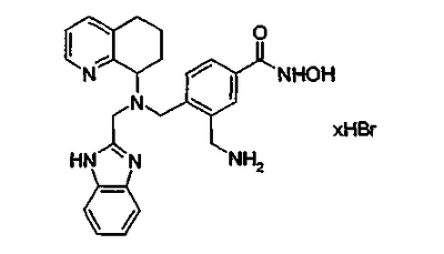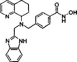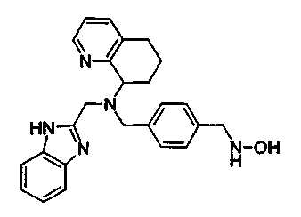 AMD9738: Получение (R,S)-4-{[(1H-бензимидазол-2-илметил)-(5,6,7,8-тетрагидрохинолин-8-ил)амино]метил}-N-гидроксибензамида. К перемешиваемому раствору метилового эфира 4-{[(1Н-бензимидазол-2-илметил)-(5,6,7,8-тетрагидрохинолин-8-ил)амино]метил}бензойной кислоты (AMD9711) (120 мг, 0,23 ммоль) в безводном MeOH (3 мл) добавляли гидрохлорид гидроксиламина (32 мг, 0,46 ммоль) с последующим добавлением гидроксида калия (39 мг, 0,69 ммоль). Полученный раствор перемешивали в течение 18 часов и в этот момент добавляли воду (5 мл) и CH2Cl2 (5 мл). Фазы разделяли и водный слой доводили до pH 7 добавлением насыщенного водного раствора гидроксида аммония, затем экстрагировали CH2Cl2 (3 × 10 мл). Объединенные органические экстракты сушили (MgSO4), фильтровали и концентрировали в вакууме. Очистка неочищенного вещества радиальной хроматографией (1 мм пластина, 10:1:1 CH2Cl2/MeOH/NH4OH) давала указанное в заголовке соединение (52 мг, 43%) в виде белого твердого вещества. 1Н ЯМР (CDCl3) Пример: 63