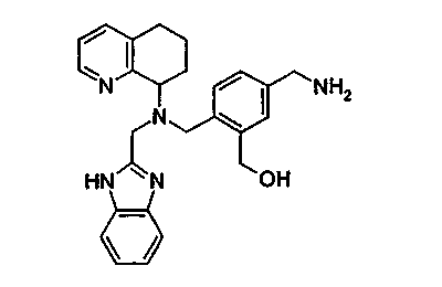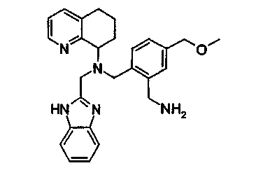 AMD11158: Получение (2-аминометил-4-метоксиметилбензил)-(1Н-бензимидазол-2-илметил)-(5,6,7,8-тетрагидрохинолин-8-ил)амина. Получение трет-бутилового эфира 2-{[[2-(трет-бутоксикарбониламинометил)-4-гидроксиметилбензил]-(5,6,7,8-тетрагидрохинолин-8-ил)амино]метил}бензимидазол-1-карбоновой кислоты трет-Бутиловый эфир 2-{[(2-аминометил-4-метоксикарбонилбензил)амино]метил}бензимидазол-1-карбоновой кислоты (1,23 г, 2,23 ммоль) растворяли в насыщенном NH3 MeOH (15 мл), обрабатывали никелем Ренея (избыток) и помещали при давлении H2 45 фн/дюйм2 (310 кПа) в вибрационный аппарат Парра на 16 часов. Смесь разбавляли MeOH и фильтровали через целит. Осадок на фильтре промывали MeOH и объединенный фильтрат концентрировали при пониженном давлении. Полученный сироп фильтровали через слой силикагеля (CH2Cl2/MeOH/NH4OH 100:2:1), получая целевой амин (720 мг), который использовали без дополнительной очистки в следующей реакции. К раствору полученного выше амина (500 мг) в ТГФ (7,2 мл), охлажденному до 0°C, добавляли по каплям LiAlH4 (1,0M в ТГФ, 1,80 мл, 1,80 ммоль). Смесь перемешивали при комнатной температуре в течение 15 минут. Добавляли MeOH (2 мл) и смесь концентрировали. Эту операцию повторяли еще два раза. Светло-желтую пену (410 мг) использовали в следующей реакции без дополнительной очистки. К раствору полученного выше спирта (330 мг) в ТГФ (2 мл) добавляли раствор BOC2О (205 мг, 0,94 ммоль) в ТГФ (4 мл) и полученную смесь перемешивали при комнатной температуре в течение 3 дней. Реакционную смесь концентрировали при пониженном давлении. Очистка желтой пены колоночной хроматографией на силикагеле (CH2Cl2/MeOH/NH4OH 100:2:1) давала целевой амин (230 мг, 30% по 3 стадиям) в виде светло-желтой пены. 1H ЯМР (CDCl3) Раствор трет-бутилового эфира 2-{[[2-(трет-бутоксикарбониламинометил)-4-гидроксиметилбензил]-(5,6,7,8-тетрагидрохинолин-8-ил)амино]метил}бензимидазол-1-карбоновой кислоты (230 мг, 0,37 ммоль) и NaH (60% дисперсия в минеральном масле, 13,3 мг, 0,56 ммоль) в ДМФ (2,0 мл) перемешивали при комнатной температуре в течение 30 минут. Добавляли иодистый метил (0,12 мл, 1,85 ммоль) и полученную смесь перемешивали при комнатной температуре в течение 1 часа. Смесь концентрировали в вакууме, разбавляли EtOAc и промывали последовательно насыщенным водным NaHCO3 (2 × 5 мл) и насыщенным водным NaCl (10 мл). Органический слой сушили (MgSO4) и концентрировали при пониженном давлении. Очистка желтой пены колоночной хроматографией на силикагеле (CH2Cl2/MeOH/NH4OH 200:1:1, затем 200:2:1) давала целевой продукт (97 мг), который использовали в следующей реакции без дополнительной очистки. К раствору полученного выше амина (96 мг) в CH2Cl2 (1 мл) добавляли ТФУК (1 мл) и полученную смесь перемешивали при комнатной температуре в течение ночи. Смесь концентрировали при пониженном давлении и сироп растворяли в H2O и подщелачивали 1 н. NaOH (pH 8). Добавляли CHCl3 (75 мл), фазы разделяли и водный слой экстрагировали CHCl3 (2 × 75 мл). Объединенные органические экстракты сушили (MgSO4), фильтровали и концентрировали при пониженном давлении. Очистка желтой пены радиальной хроматографией на силикагеле (СН2Cl2/МеОН/NH4ОН 100:1:1, затем 200:3:1) давала AMD11158 (20,2 мг, 13% по 2 стадиям) в виде белого твердого вещества. 1H ЯМР (CD3OD) Пример: 24