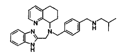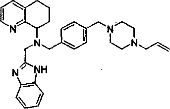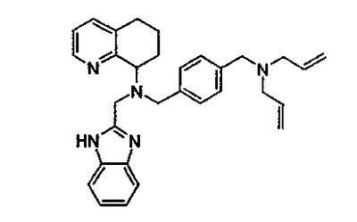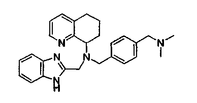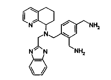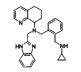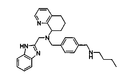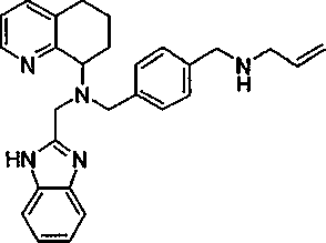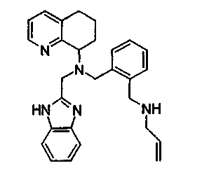 AMD9671: Получение N’-(4-{[(1Н-бензимидазол-2-илметил)-(5,6,7,8-тетрагидрохинолин-8-ил)амино]метил}бензил)этан-1,2-диамина (гидробромидная соль). Используя общую методику B, к перемешиваемому раствору N’-(1H-бензимидазол-2-илметил)-N’-(5,6,7,8-тетрагидро-8-хинолинил)-1,4-бензолдиметанамина (250 мг, 0,629 ммоль) и трет-бутилового эфира (2-оксоэтил)карбаминовой кислоты (100 мг, 0,628 ммоль) в ТГФ (6,3 мл) добавляли NaBH(ОАс)3 (173 мг, 0,816 ммоль) и смесь перемешивали при комнатной температуре в течение 22 часов. Очистка неочищенного вещества колоночной хроматографией на силикагеле (200:5:1 CH2Cl2/MeOH/NH4OH) давала бесцветное масло (47 мг). Используя общую методику D, превращение масла, полученного выше (47 мг, 0,11 ммоль) в гидробромидную соль с последующим переосаждением промежуточного твердого вещества из смеси метанол/эфир давало AMD9671 (72 мг, 14%) в виде бесцветного твердого вещества. 1Н ЯМР (D2О) Пример: 39 AMD9701: Получение (1Н-бензимидазол-2-илметил)-(4-бутиламинометилбензил)-(5,6,7,8-тетрагидрохинолин-8-ил)амина. Раствор N’-(1Н-бензимидазол-2-илметил)-N’-(5,6,7,8-тетрагидро-8-хинолинил)-1,4-бензолдиметанамина (165 мг, 0,415 ммоль) и бутиральдегида (50 мг, 0,69 ммоль) в MeOH (4 мл) кипятили с обратным холодильником в течение 30 минут. Раствор оставляли охлаждаться до комнатной температуры, добавляли 10% Pd/C (20 мг, 0,019 ммоль) и смесь перемешивали в атмосфере водорода (1 атм) при комнатной температуре в течение 20 часов. Смесь фильтровали через целит и растворитель из фильтрата удаляли при пониженном давлении. Очистка неочищенного вещества колоночной хроматографией на силикагеле (200:5:1 CH2Cl2/MeOH/NH4OH) давала AMD9701 (16 мг, 8%) в виде бесцветной пены. 1Н ЯМР (CDCl3) Пример: 40 AMD9725: Получение (1Н-бензимидазол-2-илметил)-(4-диаллиламинометилбензил)-(5,6,7,8-тетрагидрохинолин-8-ил)амина. К раствору N’-(1Н-бензимидазол-2-илметил)-N’-(5,6,7,8-тетрагидро-8-хинолинил)-1,4-бензолдиметанамина (156 мг, 0,39 ммоль) в СН2Cl2 (4 мл) добавляли N,N-диизопропилэтиламин (65 мкл, 0,37 ммоль). Добавляли по каплям аллилбромид (35 мкл, 0,40 ммоль) и полученную смесь перемешивали при комнатной температуре в течение 3 дней. Реакционную смесь разбавляли CH2Cl2 (50 мл) и промывали последовательно H2O (2 × 5 мл), насыщенным водным раствором NaHCO3 (5 мл) и насыщенным водным NaCl (5 мл). Водный слой экстрагировали CH2Cl2 (20 мл) и объединенные органические экстракты сушили (MgSO4) и концентрировали при пониженном давлении, получая светло-желтую пену (100 мг). Очистка колоночной хроматографией на силикагеле (200:1:1, затем 100:1:1 CH2Cl2:MeOH:NH4OH) с последующей радиальной хроматографией на силикагеле (1000:1:1 EtOAc:MeOH:NH4OH) давала AMD9725 (24,5 мг, 14%) в виде светло-желтой пены. 1Н ЯМР (CDCl3) Пример: 41