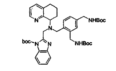 Получение трет-бутилового эфира 2-{[(2,4-дицианобензил)-(5,6,7,8-тетрагидрохинолин-8-ил)амино]метил}бензоимидазол-1-карбоновой кислоты По общей методике N-алкилирования смесь 3:1 4-метилизофталонитрила и 4-бромметилизофталонитрила, полученную на предшествующей стадии (457 мг), и (1Н-N-трет-бутоксикарбонилбензимидазол-2-илметил)-(5,6,7,8-тетрагидрохинолин-8-ил)амин (257 мг, 0,68 ммоль) преобразовывали в соответствующий продукт алкилирования с использованием следующих количеств реагентов и растворителей: диизопропилэтиламин (237 мкл, 1,36 ммоль), CH3CN (5 мл). Время реакции в данном случае составляло 3 дня при температуре реакции 40°C. Полученное неочищенное вещество очищали флэш-хроматографией (силикагель, 20:1:1 CH2Cl2/MeOH/NH4OH), получая 326 мг (93%) трет-бутилового эфира 2-{[(2,4-дицианобензил)-(5,6,7,8-тетрагидрохинолин-8-ил)амино]метил}бензоимидазол-1-карбоновой кислоты. 1H ЯМР (CDCl3) Получение трет-бутилового эфира 2-{[[2,4-бис-(трет-бутоксикарбониламинометил)бензил]-(5,6,7,8-тетрагидрохинолин-8-ил)амино]метил}бензоимидазол-1-карбоновой кислоты В колбу для гидрирования загружали 50%-ную суспензию никеля Ренея в воде (300 мг), которую затем промывали метанолом (3 × 10 мл). Затем добавляли раствор трет-бутилового эфира 2-{[(2,4-дицианобензил)-(5,6,7,8-тетрагидрохинолин-8-ил)амино]метил}бензоимидазол-1-карбоновой кислоты (326 мг, 0,63 ммоль) в MeOH (10 мл) и газообразный NH3 барботировали через раствор в течение 5 минут. Полученную гетерогенную смесь гидрировали при 50 фн/дюйм2 (345 кПа) во встряхивающем аппарате Парра в течение 18 часов, в этот момент неочищенную смесь фильтровали через целит, промывали MeOH (3 × 20 мл) и концентрировали в вакууме. Флэш-хроматография (силикагель, 20:2:1 CH2Cl2/MeOH/NH4OH, затем 10:1 MeOH/N4HOH) полученного вещества давала 124 мг (46%) свободного основания AMD9923 в виде белого твердого вещества; однако анализ сжиганием выявил, что данное вещество было загрязнено силикагелем, и это загрязнение не удалось удалить повторным фильтрованием и хроматографией (целит, флорисил, силикагель, основной оксид алюминия). Таким образом, данное соединение (60 мг, 0,14 ммоль) помещали в смесь ТГФ (5 мл), MeOH (1 мл) и воды (3 капли), затем добавляли ди-трет-бутилдикарбонат (92 мг, 0,42 ммоль). Полученный раствор перемешивали 2 часа, в этот момент добавляли насыщенный водный раствор бикарбоната натрия (5 мл) и полученную смесь экстрагировали СН2Cl2 (3 × 10 мл), затем объединенные органические экстракты сушили (MgSO4) и концентрировали в вакууме. Очистка полученного таким образом неочищенного вещества радиальной хроматографией (силикагель, 1 мм пластина, 50:1:1 CH2Cl2/MeOH/NH4OH) давала 71 мг (69%) трет-бутилового эфира 2-{[[2,4-бис-(трет-бутоксикарбониламинометил)бензил]-(5,6,7,8-тетрагидрохинолин-8-ил)амино]метил}бензимидазол-1-карбоновой кислоты в виде бесцветного масла. 1H ЯМР (CDCl3) По общей методике D для сопутствующего снятия Вос-защитной группы и образования HBr соли, обработка масла с предшествующей стадии (71 мг, 0,10 ммоль) насыщенной HBr уксусной кислотой (1 мл) давала 48 мг (60%) HBr соли AMD9923 в виде белого твердого вещества. 1H ЯМР (CD3OD) Пример: 16