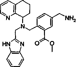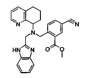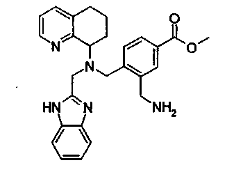 AMD11140: Получение метилового эфира 3-аминометил-4-{[(1Н-бензимидазол-2-илметил)-(5,6,7,8-тетрагидрохинолин-8-ил)амино]метил}бензойной кислоты. Получение метилового эфира 4-бромметил-3-цианобензойной кислоты Суспензию цинковой пыли (792 мг, 12,12 ммоль) и 1,2-дибромметана (44 мкл, 0,51 ммоль) в ТГФ (3 мл) перемешивали при 70°C в течение 10 минут. Смесь охлаждали до комнатной температуры и добавляли хлортриметилсилан (45 мкл, 0,36 ммоль). Смесь охлаждали до 0°C и добавляли при 0°C в течение 2 часов раствор метил 4-(бромметил)бензоата (2,314 г, 10,10 ммоль) в ТГФ (11 мл) и затем перемешивали дополнительно в течение 2 часов при 0°C. Реакционную смесь охлаждали до -78°C и добавляли раствор тозилцианида (1,556 г, 8,59 ммоль) в ТГФ (11 мл). Полученную смесь перемешивали при комнатной температуре в течение 16 часов. Смесь концентрировали при пониженном давлении, разбавляли CH2Cl2 (100 мл) и насыщенным водным NaHCO3 (15 мл) и фильтровали. Фазы разделяли и водный слой экстрагировали CH2Cl2 (3 × 50 мл). Объединенные органические экстракты сушили (MgSO4), фильтровали и концентрировали при пониженном давлении. Очистка колоночной хроматографией на силикагеле (гексаны/EtOAc 10:1) давала целевой нитрил (973 мг) в виде смеси в соотношении 16:1 (целевой продукт/побочный продукт). Раствор полученного выше нитрила (973 мг), N-бромсукцинимида (1,087 г, 6,11 ммоль) и AIBN (137 мг, 0,83 ммоль) в CCl4 (18,5 мл) кипятили с обратным холодильником в течение 4 дней. Реакционную смесь охлаждали до комнатной температуры, фильтровали и концентрировали при пониженном давлении. Очистка желтого сиропа колоночной хроматографией на силикагеле (гексаны/EtOAc 20:1, затем 40:3) давала целевой бромид (800 мг, 37% по 2 стадиям) в виде белого твердого вещества. 1H ЯМР (CDCl3) Получение трет-бутилового эфира 2-{[(2-циано-4-метоксикарбонилбензил)-(5,6,7,8-тетрагидрохинолин-8-ил)амино]метил}бензимидазол-1-карбоновой кислоты Раствор метилового эфира 4-бромметил-3-цианобензойной кислоты (800 мг, 3,15 ммоль), трет-бутилового эфира 2-[(5,6,7,8-тетрагидрохинолин-8-иламино)метил]бензимидазол-1-карбоновой кислоты (1,253 г, 3,15 ммоль), KI (26 мг, 0,16 ммоль) и DIPEA (0,82 мл, 4,72 ммоль) в CH3CN (31,5 мл) нагревали при 60°C в течение ночи. Реакционную смесь охлаждали до комнатной температуры и концентрировали при пониженном давлении. Полученный коричневый сироп разбавляли СН2Cl2 (100 мл) и промывали насыщенным водным NaCl (30 мл). Водную фазу экстрагировали СН2Cl2 (2 × 50 мл) и объединенные органические экстракты сушили (MgSO4), фильтровали и концентрировали при пониженном давлении. Очистка коричневой пены колоночной хроматографией на силикагеле (CH2Cl2/MeOH 20:1) давала целевой метиловый сложный эфир (1,74 г, 100%) в виде бежевой пены. 1H ЯМР (CDCl3) Трет-бутиловый эфир 2-{[(2-циано-4-метоксикарбонилбензил)-(5,6,7,8-тетрагидрохинолин-8-ил)амино]метил}бензимидазол-1-карбоновой кислоты (1,23 г, 2,23 ммоль) растворяли в насыщенном NH3 MeOH (15 мл), обрабатывали никелем Ренея (избыток) и помещали в атмосферу H2 под давлением 45 фн/дюйм2 (310 кПа) в аппарат Парра на 16 часов. Смесь разбавляли MeOH и фильтровали через целит. Осадок на фильтре промывали MeOH и объединенный фильтрат концентрировали при пониженном давлении. Полученный сироп фильтровали через слой силикагеля (СН2Cl2/МеОН/NH4OH 100:2:1), получая целевой амин (720 мг), который использовали без дополнительной очистки в следующей реакции. К раствору полученного выше амина (64 мг) в СН2Cl2 (1 мл) добавляли TFA (1 мл) и полученную смесь перемешивали при комнатной т