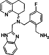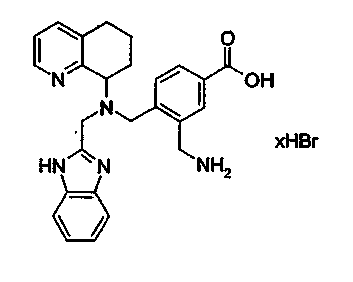 AMD11175: Получение (2-аминометил-5-фторбензил)-(1H-бензимидазол-2-илметил)-(5,6,7,8-тетрагидрохинолин-8-ил)амина (гидробромидная соль). Получение 4-фтор-2-метилбензонитрила Раствор CuCN (4,45 г, 50,0 ммоль) и NaCN (3,91 г, 80,0 ммоль) в H2O (15 мл) нагревали до 60°C. Суспензию 4-фтор-2-метиланилина (5,16 г, 412 ммоль) в H2O (20 мл) подкисляли концентрированной HCl (10 мл). Дополнительно добавляли H2O (примерно 50 мл) до тех пор, пока суспензия не перемешивалась свободно, и смесь охлаждали до температуры ниже 0°C с использованием бани лед/соленая вода. Раствор NaNO2 (3,19 г, 46,2 ммоль) в H2O (8 мл) добавляли по каплям вместе с дробленым льдом, чтобы гарантировать постоянное присутствие льда в растворе соли диазония. Смесь перемешивали при 0°C в течение 15 минут, затем для нейтрализации раствора добавляли порциями порошкообразный К2СО3 (6,62 г, 47,9 ммоль). Полученный ярко-оранжевый раствор затем добавляли порциями к раствору цианида при 60°C в течение примерно 40 минут. Полученную зеленую суспензию нагревали при 110°C в течение 45 минут и, после охлаждения до комнатной температуры, добавляли насыщенный водный раствор NaHCO3 (80 мл). Экстракция полученного густого черного раствора CH2Cl2 (150 мл x 3) не давала желаемого вещества. Оранжевое твердое вещество, которое, как было установлено, возогналось в обратный холодильник во время кипячения с обратным холодильником, смывали CH2Cl2 (100 мл) и промывали H2O (50 мл). Водный раствор экстрагировали CH2Cl2 (25 мл x 2) и объединенный органический раствор сушили (MgSO4), фильтровали и концентрировали при пониженном давлении, получая нитрил в виде желтого твердого вещества (3,00 г, 22,2 ммоль, 54%). 1H ЯМР (CDCl3) Получение 2-бромметил-4-фторбензонитрила К раствору o-толунитрила (1,62 г, 12,0 ммоль) в бензоле (80 мл) добавляли NBS (1,33 г, 7,47 ммоль) и AIBN (153 мг, 0,93 ммоль). Раствор кипятили с обратным холодильником в атмосфере азота в течение 3 часов и добавляли вторую порцию каждого из NBS (1,25 г, 7,02 ммоль) и AIBN (150 мг, 0,91 ммоль). Реакционную смесь кипятили с обратным холодильником дополнительно в течение 2 часов и, после охлаждения, раствор промывали H2O (80 мл x 2) и насыщенным раствором соли (80 мл). Органический раствор сушили (MgSO4), фильтровали и концентрировали при пониженном давлении. Очистка колоночной флэш-хроматографией на диоксиде кремния (EtOAc/гексан 1:9) давала бромид в виде оранжевого твердого вещества (721 мг, 3,37 ммоль, 28%). 1H ЯМР (CDCl3) Получение трет-бутилового эфира 2-{[(2-циано-5-фторбензил)-(5,6,7,8-тетрагидрохинолин-8-ил)амино]метил}бензимидазол-1-карбоновой кислоты Раствор бензилбромида (263 мг, 1,23 ммоль), (1-трет-бутоксикарбонил-1Н-бензимидазол-2-илметил)-(5,6,7,8-тетрагидрохинолин-8-ил)амина (381 мг, 1,01 ммоль), DIPEA (0,26 мл, 1,5 ммоль) и KI (10 мг, 0,06 ммоль) в CH3CN (7 мл) перемешивали при 60°C в атмосфере азота в течение 17 часов. После охлаждения до комнатной температуры добавляли насыщенный водный NaHCO3 (10 мл) и смесь экстрагировали CH2Cl2 (25 мл x 3). Объединенный органический раствор сушили (MgSO4), фильтровали и концентрировали при пониженном давлении. Очистка колоночной флэш-хроматографией на диоксиде кремния (EtOAc/гексан 1:1) давала третичный амин в виде бледно-желтой пены (411 мг, 0,80 ммоль, 80%). 1H ЯМР (CDCl3) Получение 2-{[(1H-бензимидазол-2-илметил)-(5,6,7,8-тетрагидрохинолин-8-ил)амино]метил}-4-фторбензонитрила К LiOH·H2O (51 мг, 1,2 ммоль) и 10% Pd/C (39 мг, 0,04 ммоль) в круглодонной 50 мл колбе, продутой азотом, добавляли H2O (2 мл). Добавляли раствор нитрила (201 мг, 0,39 ммоль) в диоксане (6 мл), затем N