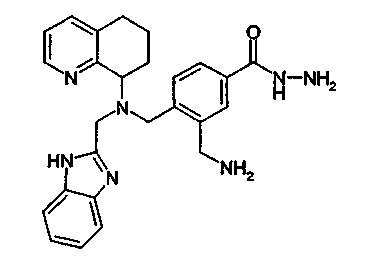 AMD11190: Гидразид 3-аминометил-4-{[(1Н-бензимидазол-2-илметил)-(5,6,7,8-тетрагидрохинолин-8-ил)амино]метил}бензойной кислоты (гидробромидная соль). Получение трет-бутилового эфира (2-{[(1Н-бензимидазол-2-илметил)-(5,6,7,8-тетрагидрохинолин-8-ил)амино]метил}-5-гидразинокарбонилбензил)карбаминовой кислоты К раствору метилового эфира 4-{[(1Н-бензимидазол-2-илметил)-(5,6,7,8-тетрагидрохинолин-8-ил)амино]метил}-3-(трет-бутоксикарбониламинометил)бензойной кислоты (100 мг, 0,18 ммоль) в этаноле (2 мл) добавляли гидразингидрат (0,5 мл, 10,31 ммоль). Реакционную смесь нагревали при 80°C в течение ночи. Затем ее охлаждали, гасили насыщенным бикарбонатом натрия (2 мл) и промывали CH2Cl2 (4 × 5 мл). Объединенные органические слои сушили (MgSO4), фильтровали, концентрировали и сушили в вакууме, получая желтое масло. Очистка радиальной хроматографией на силикагеле (1 мм пластина, с использованием СН3OH/NH4OH/CH2Cl2; 1:1:98, затем 2:1:97) давала продукт в виде неочищенного белого твердого вещества (60 мг), которое использовали без дополнительной очистки. 1H ЯМР (CDCl3) Получение гидразида 3-аминометил-4-{[(1Н-бензимидазол-2-илметил)-(5,6,7,8-тетрагидрохинолин-8-ил)амино]метил}бензойной кислоты (гидробромидная соль) К раствору указанного выше твердого вещества (30 мг, 0,054 ммоль) в уксусной кислоте (1 мл) добавляли раствор бромистоводородной кислоты в уксусной кислоте (0,5 мл) и реакционную смесь перемешивали в течение 30 минут. Затем добавляли диэтиловый эфир до тех пор, пока не осаждалось AMD11190 в виде белого твердого вещества (35 мг, 77%). 1H ЯМР (D2О) Пример: 21