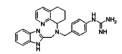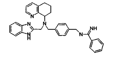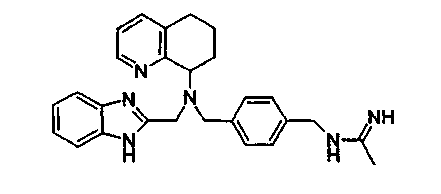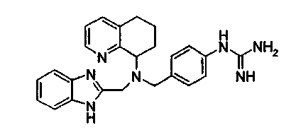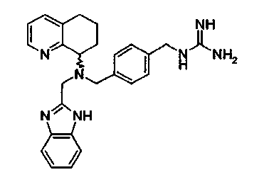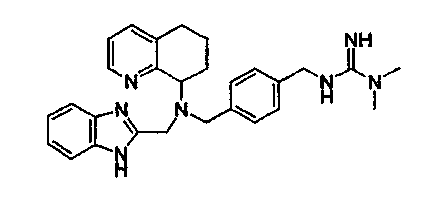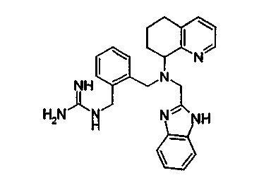 AMD9596: Получение N-(4-{[(1Н-бензимидазол-2-илметил)-(5,6,7,8-тетрагидрохинолин-8-ил)амино]метил}бензил)гуанидина (гидробромидная соль). К раствору N’-(1H-бензимидазол-2-илметил)-N’-(5,6,7,8-тетрагидро-8-хинолинил)-1,4-бензолдиметанамина (397 мг, 1,0 ммоль) в ТГФ (10 мл) добавляли N,N’-ди-трет-бутоксикарбонилпиразол-1-карбоксамидин (370 мг, 1,2 ммоль) и карбонат калия (207 мг, 1,5 ммоль) и смесь перемешивали при комнатной температуре в течение 16 часов. Реакционную смесь разбавляли водным NH4Cl (15 мл) и смесь экстрагировали этилацетатом (3 × 10 мл). Объединенные органические фракции сушили (Na2SO4), фильтровали, концентрировали и очищали хроматографией на силикагеле (19:1 CH2Cl2/MeOH), получая N’,N”-ди-трет-бутоксикарбонил-N-(4-{[(1Н-бензимидазол-2-илметил)-(5,6,7,8-тетрагидрохинолин-8-ил)амино]метил}бензил)гуанидин в виде тусклой пены (426 мг, 67%). 1H ЯМР (CDCl3) Используя общую методику D, превращение полученного выше вещества (106 мг, 0,1 ммоль) в гидробромидную соль с одновременным удалением Boc-групп давало AMD 9596 (108 мг) в виде белого кристаллического твердого вещества. 1H ЯМР (D2O) Пример: 26 AMD9735: Получение N’-(4-{[(1Н-бензимидазол-2-илметил)-(5,6,7,8-тетрагидрохинолин-8-ил)амино]метил}бензил)-N,N-диметилгуанидина (гидробромидная соль). Получение гидрохлорида N,N-диметил-1Н-пиразол-1-карбоксамидина К раствору пиразола (1,01 г, 14,8 ммоль) и диметилцианамида (1,20 мл, 14,8 ммоль) в 1,4-диоксане (15 мл) добавляли HCl (4,0 н. в 1,4-диоксан, 3,8 мл, 15,2 ммоль) и полученную смесь кипятили с обратным холодильником в течение 3 часов. Реакционную смесь охлаждали до комнатной температуры и разбавляли безводным эфиром (15 мл) для осаждения желтого твердого вещества. Полученному осадку давали возможность осесть на дно колбы (в течение ночи) и надосадочный раствор декантировали. Твердое вещество сушили в вакууме и получали указанное в заголовке соединение (2,01 г, 78%). ES-MS m/z 139 (М+H). К раствору N’-(1Н-бензимидазол-2-илметил)-N’-(5,6,7,8-тетрагидро-8-хинолинил)-1,4-бензолдиметанамина (0,221 г, 0,56 ммоль) в ДМФ (1 мл) добавляли гидрохлорид N,N-диметил-1Н-пиразол-1-карбоксамидина (0,250 г, 1,18 ммоль) и N,N-диизопропилэтиламин (0,70 мл, 4,02 ммоль) и полученную смесь перемешивали при комнатной температуре в течение 19 часов. Реакционную смесь разбавляли водой (5 мл) и CH2Cl2 (25 мл) и pH водной фазы доводили до 4 с использованием разбавленного водного HCl (1 н., 3 мл). Фазы разделяли и водную фазу экстрагировали CH2Cl2 (3×10 мл). Водную фазу концентрировали при пониженном давлении и полученное бесцветное масло растворяли в 10 н. NaOH (4 мл). Основный водный раствор экстрагировали CH2Cl2 (4 × 10 мл) и объединенные органические экстракты сушили (Na2SO4) и концентрировали. Неочищенное вещество очищали радиальной хроматографией на силикагеле (1 мм пластина, 1:1:1 СН3CN/CH3OH/NH4OH) и получали белое твердое вещество (147 мг). Используя общую методику D, превращение свободного основания (124 мг) в гидробромидную соль, с последующим переосаждением промежуточного твердого вещества из смеси метанол/эфир, давало AMD9735 (121 мг) в виде белого твердого вещества. 1H ЯМР (D2О) Пример: 27 AMD9777: Получение [4-(1Н-бензимидазол-2-илметил)-(5,6,7,8-тетрагидрохинолин-8-ил)аминометилбензил]-N,N-диметилформамидина (гидробромидная соль). Раствор 2-пиридинсульфонилхлорида (41 мг, 0,23 ммоль) в ДМФ (0,75 мл) перемешивали в течение 10 минут, после чего добавляли раствор N’-(1H-бензимидазол-2-илметил)-N’-(5,6,7,8-тетрагидро-8-хинолинил)-1,4-бензолдиметанамина (62 мг, 0,16 ммоль) в ДМФ (0,8 мл) и реакционн