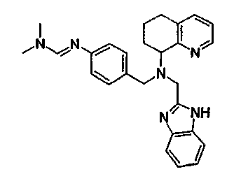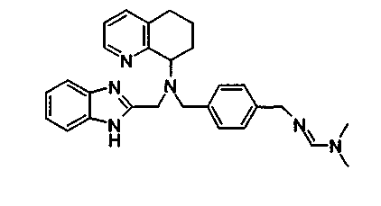 AMD9774: Получение N’-({[(1Н-бензимидазол-2-илметил)-(5,6,7,8-тетрагидрохинолин-8-ил)амино]метил}фенил)-N,N-диметилформамидина. Получение O-метансульфонил-4-(трет-бутоксикарбонил)аминобензилового спирта Используя общую методику С, к раствору 4-(трет-бутоксикарбонил)аминобензилового спирт (446 мг, 2 ммоль) в CH2Cl2 (10 мл) добавляли метансульфонилхлорид (0,23 мл, 3 ммоль) и триэтиламин (0,56 мл, 4 ммоль). Раствор перемешивали в течение 60 минут при комнатной температуре. Очистка неочищенного продукта хроматографией на силикагеле (2% MeOH/CH2Cl2) давала указанное в заголовке соединение (320 мг, 56%) в виде масла. 1H ЯМР (CDCl3) Используя общую методику N-алкилирования, к раствору полученного выше мезилата (213 мг, 0,75 ммоль) и N,N-диизопропилэтиламина (0,178 мл, 1,0 ммоль) в CH3CN (10 мл) добавляли (1-трет-бутоксикарбонил-1Н-бензимидазол-2-илметил)-(5,6,7,8-тетрагидрохинолин-8-ил)амин (210 мг, 0,55 ммоль) и смесь перемешивали при 60°C в течение 4 часов. Очистка неочищенного продукта хроматографией на силикагеле (20:1 CH2Cl2/MeOH) давала (1Н-N-трет-бутоксикарбонилбензимидазол-2-илметил)-[4-(трет-бутоксикарбониламино)бензил]-(5,6,7,8-тетрагидрохинолин-8-ил)амин (126 мг, 39%). 1H ЯМР (CDCl3) К раствору (1Н-N-трет-бутоксикарбонилбензимидазол-2-илметил)-[4-(трет-бутоксикарбониламино)бензил]-(5,6,7,8-тетрагидрохинолин-8-ил)амина (62 мг, 0,106 ммоль) в CH2Cl2 (2 мл) добавляли трифторуксусную кислоту (1 мл). Смесь перемешивали при комнатной температуре в течение 2 часов, затем концентрировали. Остаток помещали в CH2Cl2, промывали 15%-ным NaOH (3 мл) и несколько раз экстрагировали CH2Cl2, Объединенные органические фракции сушили над безводным сульфатом натрия, фильтровали и концентрировали. Неочищенный (1Н-бензимидазол-2-илметил)-[4-аминобензил]-(5,6,7,8-тетрагидрохинолин-8-ил)амин затем добавляли к раствору 2-пиридинсульфонилхлорида (27 мг, 0,15 ммоль) в ДМФ (1 мл). Полученный раствор перемешивали при комнатной температуре в течение 30 минут. Смесь затем концентрировали, помещали в СН2Cl2 и промывали водным карбонатом калия. Органическую фракцию затем сушили над безводным сульфатом натрия, фильтровали, концентрировали и очищали хроматографией на силикагеле (10:1:0,1 CH2Cl2:MeOH:NH4OH), получая N’-({[(1H-бензимидазол-2-илметил)-(5,6,7,8-тетрагидрохинолин-8-ил)амино]метил}фенил)-N,N-диметилформамидин (21 мг, 47%). 1H ЯМР (CDCl3) Используя общую методику D, превращение N’-({[(1H-бензимидазол-2-илметил)-(5,6,7,8-тетрагидрохинолин-8-ил)амино]метил}фенил)-N,N-диметилформамидина (21 мг, 0,047 ммоль) в гидробромидную соль давало AMD9774 (14 мг) в виде белого твердого вещества. 1H ЯМР (D2O) Пример: 57