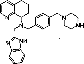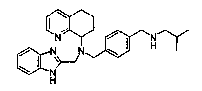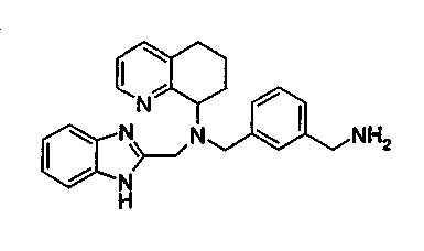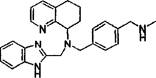 AMD9679: Получение N’-(1Н-бензимидазол-2-илметил)-N’-(5,6,7,8-тетрагидро-8-хинолинил)-1,3-бензолдиметанамина. К перемешиваемому раствору 8-амино-5,6,7,8-тетрагидрохинолина (6,43 г, 43 ммоль) в CH2Cl2 (450 мл) при комнатной температуре добавляли 3-цианобензальдегид (5,69 г, 43 ммоль) и триацетоксиборгидрид натрия (17,0 г, 80 ммоль) и смесь перемешивали 16 часов. Реакцию гасили 1 н. NaOH (200 мл) и фазы разделяли. Органическую фазу сушили (Na2SO4) и концентрировали при пониженном давлении, получая желтое масло (11,7 г), которое очищали флэш-хроматографией на силикагеле (97:3 СН2Cl2/СН3ОН), получая N-(5,6,7,8-тетрагидро-8-хинолинил)-3-цианобензиламин (9,10 г, 81%) в виде бледно-желтого твердого вещества. Используя общую методику N-алкилирования, раствор указанного выше вещества (4,17 г, 15,8 ммоль), иодида калия (130 мг, 0,80 ммоль) и N,N-диизопропилэтиламина (5,2 мл, 30 ммоль) в СН3CN (160 мл) подвергали взаимодействию с N-(трет-бутоксикарбонил)-2-хлорметилбензимидазолом (полученным, как описано An, H.; Wang, Т.; Mohan, V.; Grifley, R.H.; Cook, P.D. Tetrahedron 1998, 54, 3999-4012) (4,22 г, 15,8 ммоль). Очистка неочищенного вещества флэш-хроматографией на силикагеле (1:1 EtOAc/гексаны) давала алкилированный продукт (6,86 г, 88%) в виде желтой пены. К раствору полученного выше вещества (6,86 г, 13,9 ммоль) в насыщенном NH3 метаноле (100 мл) в сосуде Парра добавляли никель Ренея (примерно 1 г) и смесь гидрировали при давлении водорода 50 фн/дюйм2 (345 кПа) в аппарате Парра для гидрирования в течение 17 часов. Полученную смесь фильтровали через Целит 521 и растворитель из элюента удаляли в вакууме. Очистка неочищенного вещества флэш-хроматографией на силикагеле (5% CH2Cl2/CH3OH/NH4OH, 19:1:0, затем 18:1:1) давала AMD9679 (4,36 г, 79%) в виде желтого пенообразного твердого вещества. 1H ЯМР (CDCl3) Пример: 2