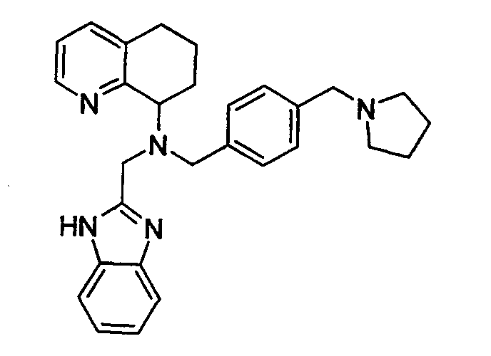 AMD9726: Получение (4-аллиламинометилбензил)-(1Н-бензимидазол-2-илметил)-(5,6,7,8-тетрагидрохинолин-8-ил)амина. К раствору N’-(1Н-бензимидазол-2-илметил)-N’-(5,6,7,8-тетрагидро-8-хинолинил)-1,4-бензолдиметанамина (200 мг, 0,39 ммоль) в CH2Cl2 (0,4 мл) добавляли N,N-диизопропилэтиламин (90 мкл, 0,52 ммоль). Аллилбромид (35 мкл, 0,40 ммоль) растворяли в CH2Cl2 (9,6 мл) и добавляли к смеси аминов со скоростью 5,5 мл/час. Полученную смесь перемешивали при комнатной температуре в течение 24 часов. Реакционную смесь разбавляли СН2Cl2 (50 мл) и промывали последовательно H2O (5 мл), насыщенным водным раствором NaHCO3 (5 мл) и насыщенным водным NaCl (5 мл). Водный слой экстрагировали CH2Cl2 (20 мл) и объединенные органические экстракты сушили (MgSO4) и концентрировали при пониженном давлении. Очистка колоночной хроматографией на силикагеле (200:1:1, затем 100:1:1 EtOAc:MeOH:NH4OH) с последующей радиальной хроматографией на силикагеле (250:1:1 EtOAc:MeOH:NH4OH) давала AMD9725 (36 мг, 21%) в виде светло-желтой пены. 1Н ЯМР (CDCl3) Пример: 42 AMD9754: Получение (1Н-бензимидазол-2-илметил)-(4-пирролидин-1-илметилбензил)-(5,6,7,8-тетрагидрохинолин-8-ил)амина. Используя общую методику B, к перемешиваемому раствору 4-{[(1Н-бензимидазол-2-илметил)-(5,6,7,8-тетрагидрохинолин-8-ил)амино]метил}бензальдегида (150 мг, 0,37 ммоль), пирролидина (30 мкл, 0,36 ммоль) и AcOH (20 мкл, 0,37 ммоль) в ТГФ (4 мл) добавляли NaBH(ОАс)3 (235 мг, 1,11 ммоль) и смесь перемешивали при комнатной температуре в течение 1,5 часов. Очистка неочищенной белой пены (205 мг) колоночной хроматографией на силикагеле (100:1:1 CH2Cl2:MeOH:NH4OH) давала целевой продукт (160 мг, 96%) в виде белой пены. Используя общую методику D, преобразование полученной выше пены в гидробромидную соль давала AMD9754 в виде белого твердого вещества. 1Н ЯМР (CD3OD) Пример: 43