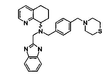 AMD9698: Получение (1Н-бензоимидазол-2-илметил)-(5,6,7,8-тетрагидрохинолин-8-ил)-(4-тиоморфолин-4-илметилбензил)амина Согласно общему способу A, 4-{[(1Н-бензоимидазол-2-илметил)-(5,6,7,8-тетрагидрохинолин-8-ил)амино]метил}бензальдегид (200 мг, 0,50 ммоль) и тиоморфолин (51 мкл, 0,50 ммоль) превращали в соответствующий продукт восстановительного аминирования с использованием следующих количеств реагентов и растворителей: цианоборгидрид натрия (63 мг, 1,0 ммоль), MeOH (3 мл). Время реакции в этом случае составляло 5 часов. Очистка полученного таким образом неочищенного вещества радиальной хроматографией (силикагель, 1 мм пластина, 50:2:1 CH2Cl2:MeOH:NH4OH) давала 63 мг (26%) AMD9698 в виде белой пены. 1Н ЯМР (CDCl3) Пример: 45