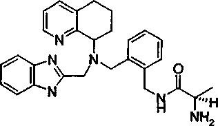 AMD11133: Получение (1H-бензимидазол-2-илметил)-[2-(R)-(2-аминопропиоамидилметил)бензил]-(5,6,7,8-тетрагидрохинолин-8-ил)амина (гидробромидная соль). К раствору N-трет-бутоксикарбонил-l-аланина (37 мг, 0,195 ммоль) в дихлорметане (5 мл) добавляли, в следующей последовательности: диизопропилэтиламин (0,08 мл, 0,468 ммоль), 1-гидроксибензотриазол ((HOBT) 32 мг, 0,234 ммоль), (1H-бензимидазол-2-илметил)-(2-аминометилбензил)-(5,6,7,8-тетрагидрохинолин-8-ил)амин (62 мг, 0,156 ммоль) и гидрохлорид 1-(3-диметиламинопропил)-3-этилкарбодиимида ((EDAC) 45 мг, 0,234 ммоль). Полученный раствор затем перемешивали в течение ночи при комнатной температуре в атмосфере азота. Раствор затем экстрагировали водным хлоридом аммония, сушили, концентрировали и очищали флэш-хроматографией на силикагеле с использованием раствора 20:1 дихлорметан:метанол в качестве элюента, получая (1H-бензимидазол-2-илметил)-{2-(R)-[2-(N-трет-бутоксикарбонил)аминопропиоамидилметил]бензил}-(5,6,7,8-тетрагидрохинолин-8-ил)амин в виде смеси двух диастереоизомеров с выходом 61 мг (69%). 1Н ЯМР (CDCl3) (1H-Бензимидазол-2-илметил)-{2-(R)-[2-(N-трет-бутоксикарбонил)аминопропиоамидилметил]бензил}-(5,6,7,8-тетрагидрохинолин-8-ил)амин (61 мг 0,107 ммоль) помещали в уксусную кислоту (1 мл), к которой добавляли насыщенный раствор HBr в уксусной кислоте (1 мл). Смесь затем перемешивали, осаждали и выделяли по методике D, получая AMD11133 в виде белого кристаллического твердого вещества с выходом 64 мг. 1Н ЯМР (D2О) Пример: 48