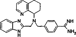 AMD9773: Получение [4-(1Н-бензимидазол-2-илметил)-(5,6,7,8-тетрагидрохинолин-8-ил)аминометил]бензамидина (гидробромидная соль). Используя общую методику B, к раствору 4-цианобензальдегида (0,15 г, 1,1 ммоль) и (1-трет-бутоксикарбонил-1Н-бензимидазол-2-илметил)-(5,6,7,8-тетрагидрохинолин-8-ил)амина (0,38 г, 1,0 ммоль) в CH2Cl2 (10 мл) добавляли NaBH(OAc)3 (0,36 г, 1,7 ммоль) и смесь перемешивали при комнатной температуре в течение 6 часов. Очистка неочищенного вещества колоночной хроматографией на силикагеле (2% MeOH/CH2Cl2) давала N-алкилированный продукт (0,26 г, 72%) в виде белого твердого вещества. 1H ЯМР (CDCl3) В раствор полученного выше вещества (0,26 г, 0,53 ммоль) в безводном EtOH (3,5 мл) при 0°C барботировали газообразный HCl в течение 30 минут и смесь перемешивали при комнатной температуре дополнительно в течение 4 часов. Реакционную смесь концентрировали при пониженном давлении и полученный остаток промывали диэтиловым эфиром (3 × 20 мл) и сушили в вакууме, получая целевую HCl соль этоксиимина, которую непосредственно использовали в следующей реакции. 1H ЯМР (D2O) К раствору гидрохлоридной соли (N-трет-бутоксикарбонилбензимидазол-2-илметил)-(4-этоксииминбензил)-(5,6,7,8-тетрагидрохинолин-8-ил)амина (полученного выше) в безводном EtOH (3 мл) добавляли карбонат аммония (0,24 г, 2,5 ммоль) и раствор перемешивали при комнатной температуре в течение 16 часов. Реакционную смесь концентрировали при пониженном давлении и очищали хроматографией через слой силикагеля (МеОН/NH4OH/СН2Cl2, 15:10:75), получая целевой бензамидин (0,10 г, 48% выход по 2 стадиям) в виде белого порошка. 1H ЯМР (CDCl3) Используя общую методику D, превращение полученного выше вещества (100 мг) в гидробромидную соль давало AMD9773 (70 мг) в виде белого твердого вещества. 1H ЯМР (D2О) Пример: 59