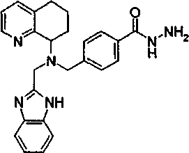 AMD9743: Получение гидразида 4-{[(1Н-бензимидазол-2-илметил)-(5,6,7,8-тетрагидрохинолин-8-ил)амино]метил}бензойной кислоты. К перемешиваемому раствору метилового эфира 4-{[(1Н-бензимидазол-2-илметил)-(5,6,7,8-тетрагидрохинолин-8-ил)амино]метил}бензойной кислоты (AMD9711) (140 мг, 0,33 ммоль) в безводном этаноле (3 мл) добавляли моногидрат гидразина (0,5 мл, 10,3 ммоль) и полученную смесь нагревали при 80°C в течение 24 часов. Добавляли насыщенный водный раствор бикарбоната аммония (5 мл), фазы разделяли и водный слой экстрагировали CH2Cl2 (3 × 10 мл). Объединенные органические экстракты сушили (MgSO4) и концентрировали в вакууме. Очистка неочищенного вещества радиальной хроматографией (1 мм пластина, 75:1:1 CH2Cl2-MeOH-NH4OH) давала указанное в заголовке соединение (89 мг, 61%) в виде белого твердого вещества. 1Н ЯМР (CDCl3) Пример: 64