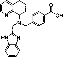 AMD9769: Получение 4-{[(1Н-бензимидазол-2-илметил)-(5,6,7,8-тетрагидрохинолин-8-ил)амино]метил}бензойной кислоты (гидробромидная соль). К раствору метилового эфира 4-{[(1Н-бензимидазол-2-илметил)-(5,6,7,8-тетрагидрохинолин-8-ил)амино]метил}бензойной кислоты (AMD9711) (90 мг, 0,21 ммоль) в MeOH (2,5 мл) добавляли водный NaOH (3,5 м, 0,30 мл, 1,05 ммоль). Реакционную смесь нагревали при 40°C в течение 16 часов, после чего раствор концентрировали, промывали насыщенным водным NaHCO3 (10 мл) и экстрагировали CH2Cl2 (2 × 50 мл). Водный слой подкисляли до pH 4 10% водной HCl, насыщенной NaCl (твердый) и продукт экстрагировали CH2Cl2 (3 x 75 мл). Объединенные органические экстракты сушили над MgSO4 и концентрировали, получая светло-желтую пену. 1Н ЯМР (300 МГц, CDCl3) По общей методике D превращение полученной выше пены в гидробромидную соль давало AMD9769. 1Н ЯМР (300 МГц, D2О) Пример: 65