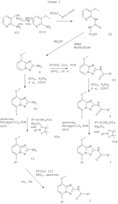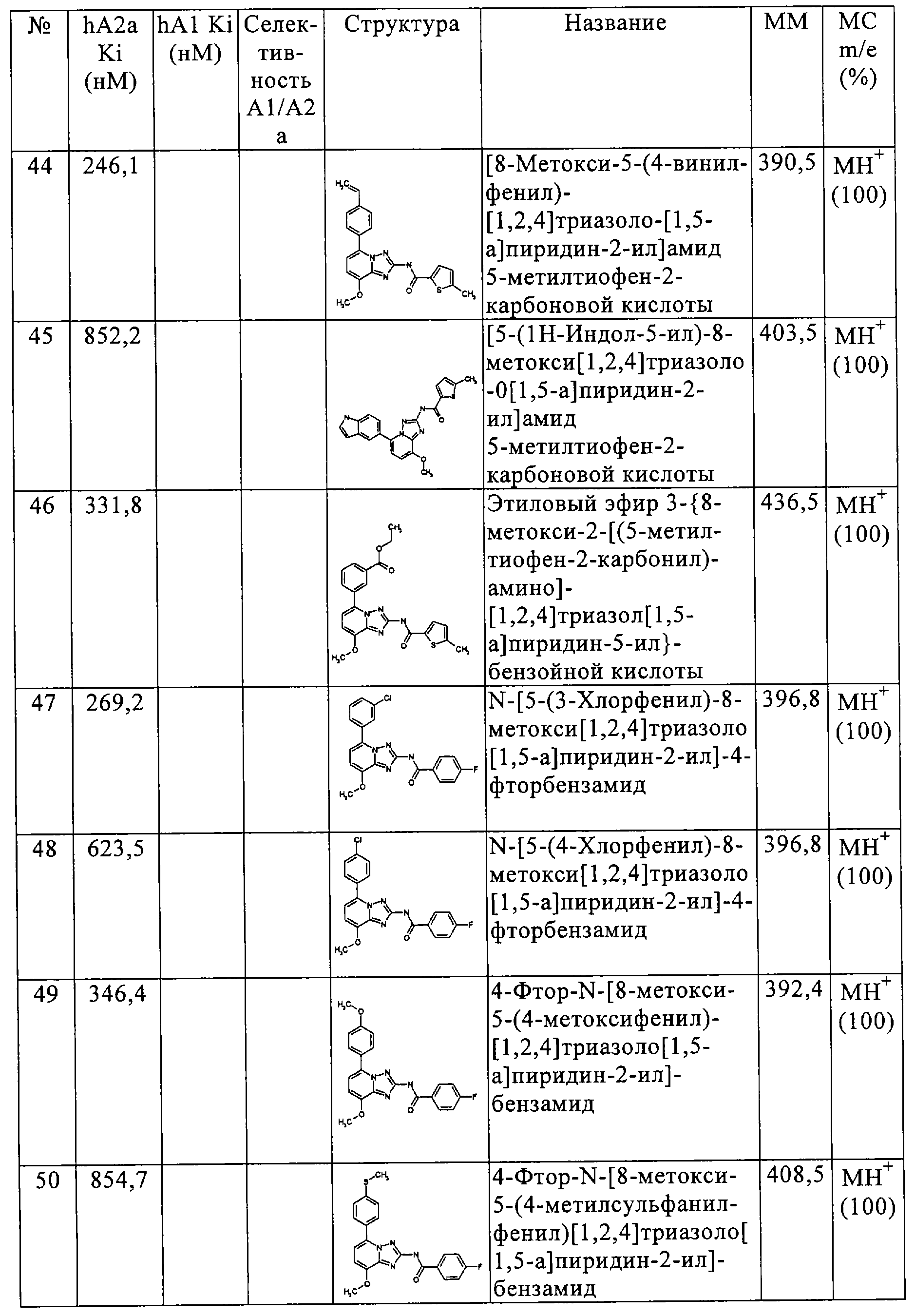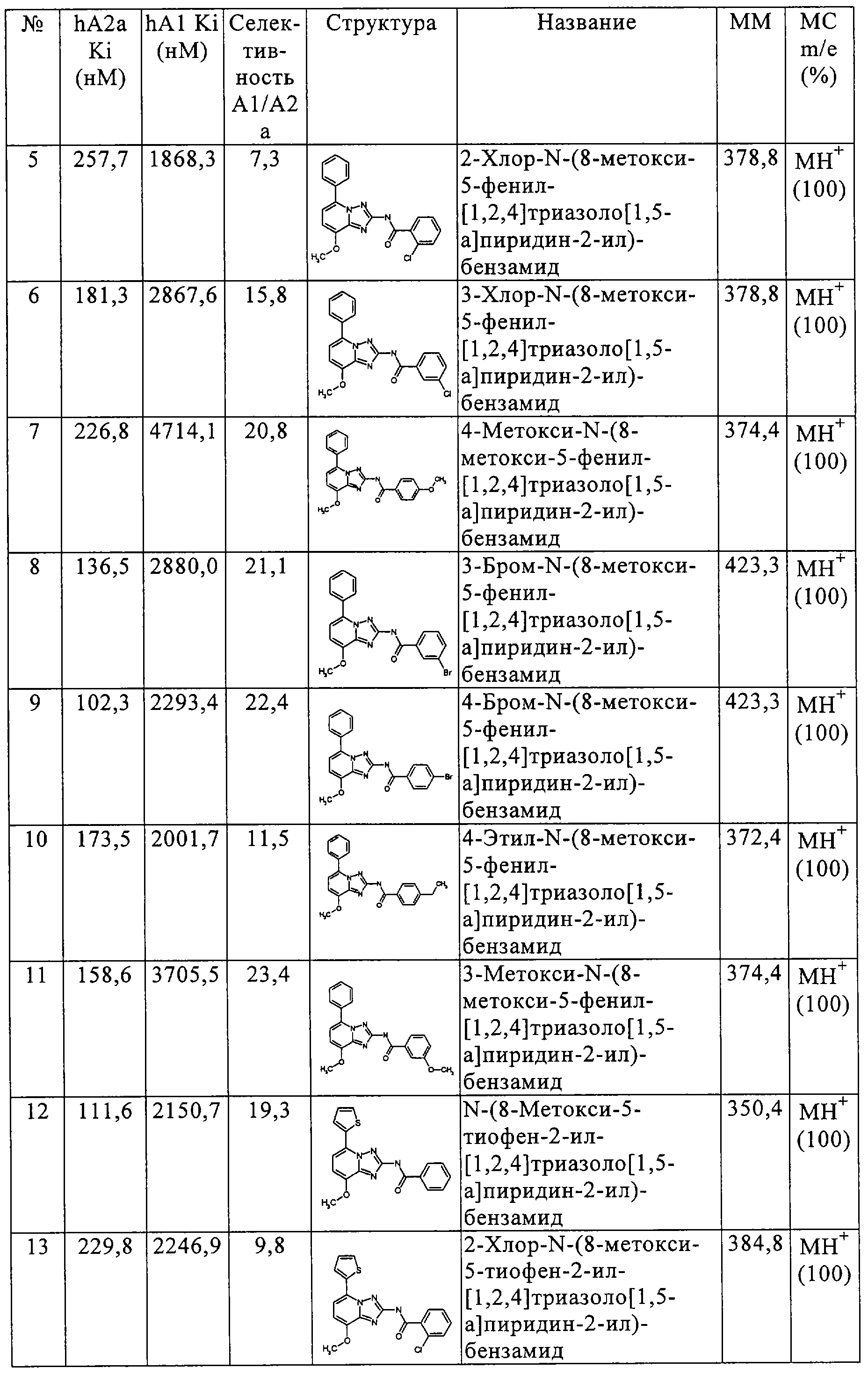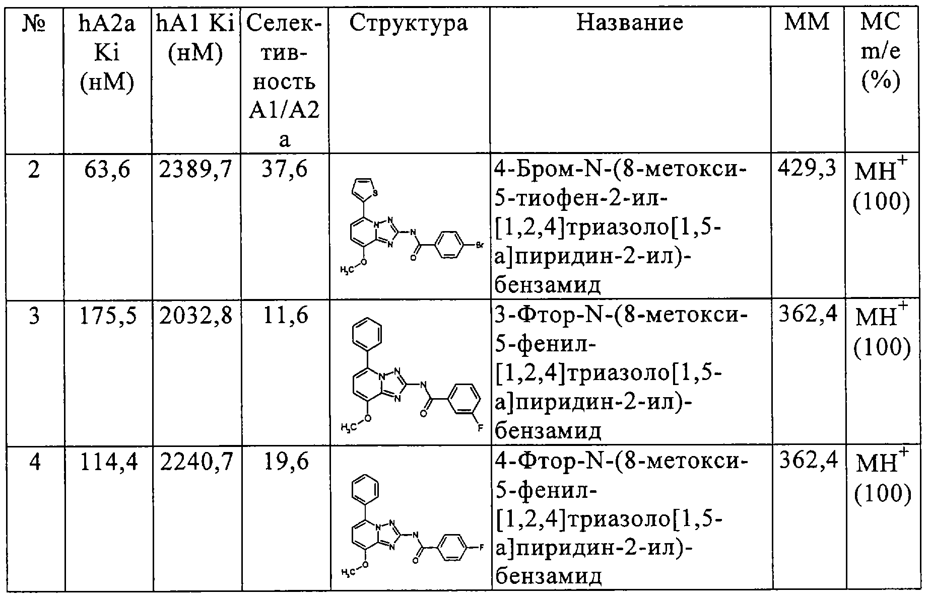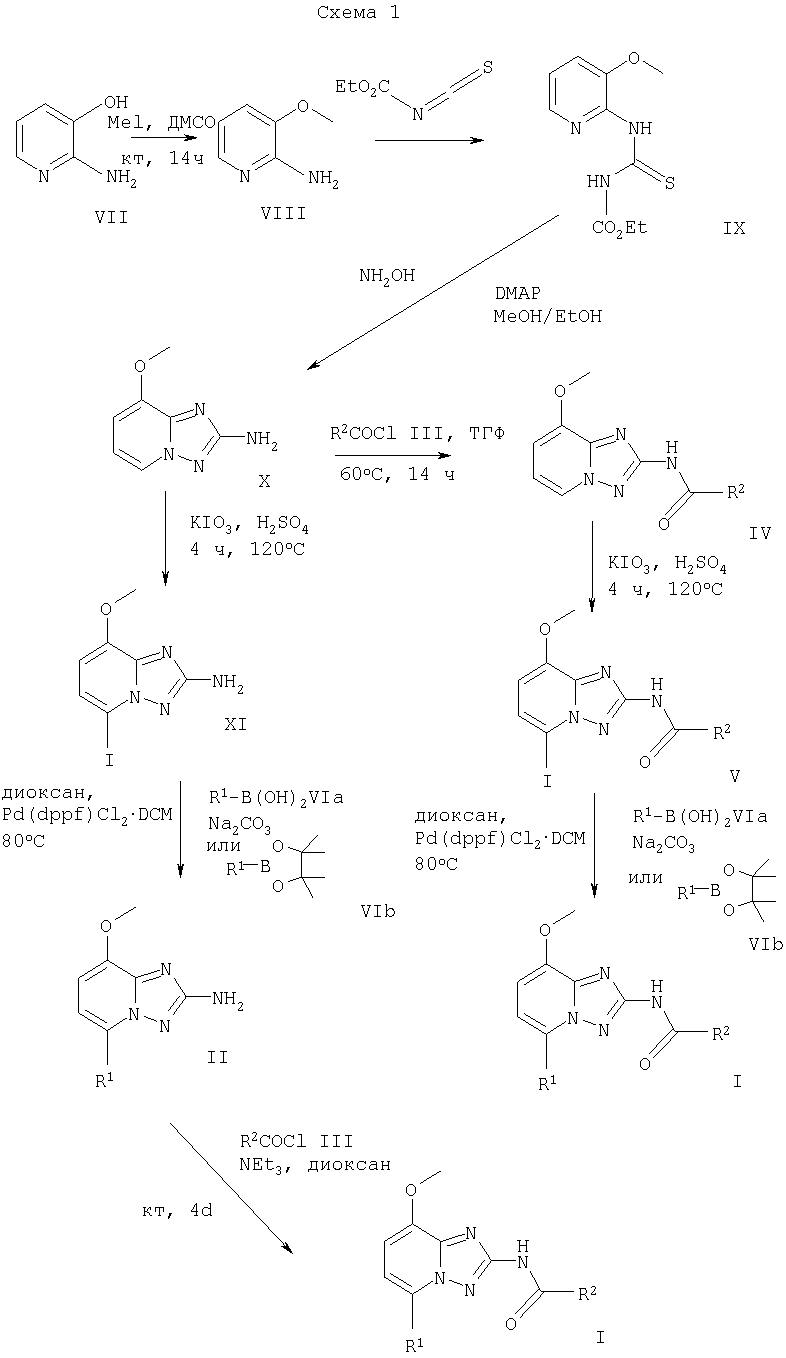 R1 и R2 имеют значения, указанные выше. На схеме показан способ получения производных 8-метокси[1,2,4]триазол[1,5-а]пиридина из соединения формулы VII (коммерческий препарат). К суспензии КОН в ДМСО добавляют 2-амино-3-гидроксипиридин (VII) и раствор перемешивают. Затем добавляют метилиодид и получают соединение VIII. Смесь соединения VIII и этоксикарбонилизотиоцианата в диоксане перемешивают при комнатной температуре с образованием соединения IX. Затем к раствору гидрохлорида гидроксиламина и н-этилдиизопропиламина в смеси метанол/этанол добавляют N-(3-метокси-2-пиридинил)-N’-карбоэтокситиомочевину с образованием соединения формулы X. Полученное соединение, 8-метокси[1,2,4]триазоло[1,5-а]пиридин-2-иламид, растворяют в соединении формулы R2COCl (III) с образованием соединения формулы IV. Соединение формулы III может представлять собой бензоилхлорид, 4-F-бензоилхлорид, циклогексанхлоркарбонил и т.п. Кроме того, соединение формулы Х можно растворить в серной кислоте, а затем нагреть до приблизительно 100°С и по частям в течение 1 ч добавить KIO3. Затем в полученном соединении формулы Х атом йода заменяют на заместитель R1, при этом в качестве исходного соединения используют 8-метокси-5-иод[1,2,4]триазоло[1,5-а]пиридин-2-иламин, а в качестве реагента – соответствующую бороновую кислоту или сложный эфир, например, как приведенные в следующем списке, при этом получают соединение формулы I. Получение соли проводят при комнатной температуре известными способами, в том числе специалистам в данной области техники. При этом речь идет как о солях неорганических кислот, так и о солях органических кислот. Примерами таких солей являются гидрохлориды, гидробромиды, сульфаты, нитраты, цитраты, ацетаты, малеаты, сукцинаты, метансульфонаты, пара-толуолсульфонаты и т.п. Соединения формулы I и их фармацевтически приемлемые кислотно-аддитивные соли обладают ценными фармакологическими свойствами. Установлено, что соединения по настоящему изобретению прежде всего являются лигандами рецептора аденозина. Биологическую активность соединений определяли по следующей методике. Связывание с аденозиновым рецептором А2А человека Аденозиновый рецептор А2А человека рекомбинантно экспрессировали в яйцеклетках китайского хомячка (СНО) при использовании системы экспрессии вируса леса Семлики. Клетки собирали, дважды промывали центрифугированием, гомогенизировали и вторично промывали центрифугированием. Промытый осадок, содержащий мембранную фракцию, суспендировали в буферном растворе трис-50 мМ (рН 7,4), содержащем 120 мМ NaCl, 5 мМ KCl, 2 мМ CaCl2 и 10 мМ MgCl2 (буферный раствор А). Анализ связывания [3H]-SCH-58261 (Dionisotti и др., Br. J. Pharmacol., 121, 353 (1997)) проводили в 96-луночных планшетах в присутствии 2,5 мкг мембранного белка, 0,5 мг гранул SPA, покрытых Ysi-поли-L-лизином и 0,1 ед. аденозиндеаминазы в конечном объеме 200 мкл буфера А. Неспецифическое связывание определяли в присутствии родственного соединения ксантинамина (ХАС, 2 мкМ). Связывание анализируемых соединений определяли при 10 концентрациях от 10 мкМ до 0,3 нМ. Все анализы выполняли в повторных экспериментах и повторяли по меньшей мере дважды. Аналитичекие планшеты инкубировали при комнатной температуре в течение 1 ч, центрифугировали и определяли количество связанного лиганда, содержащего радиоактивную метку, на сцинтилляционном счетчике (Packard Topcount). Величины IC50