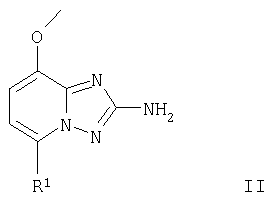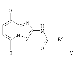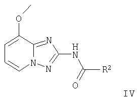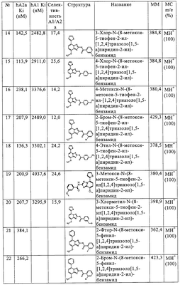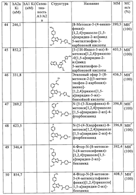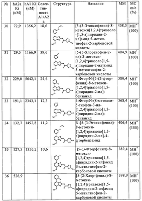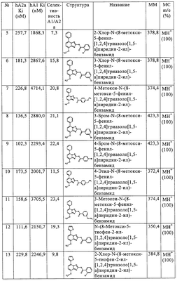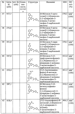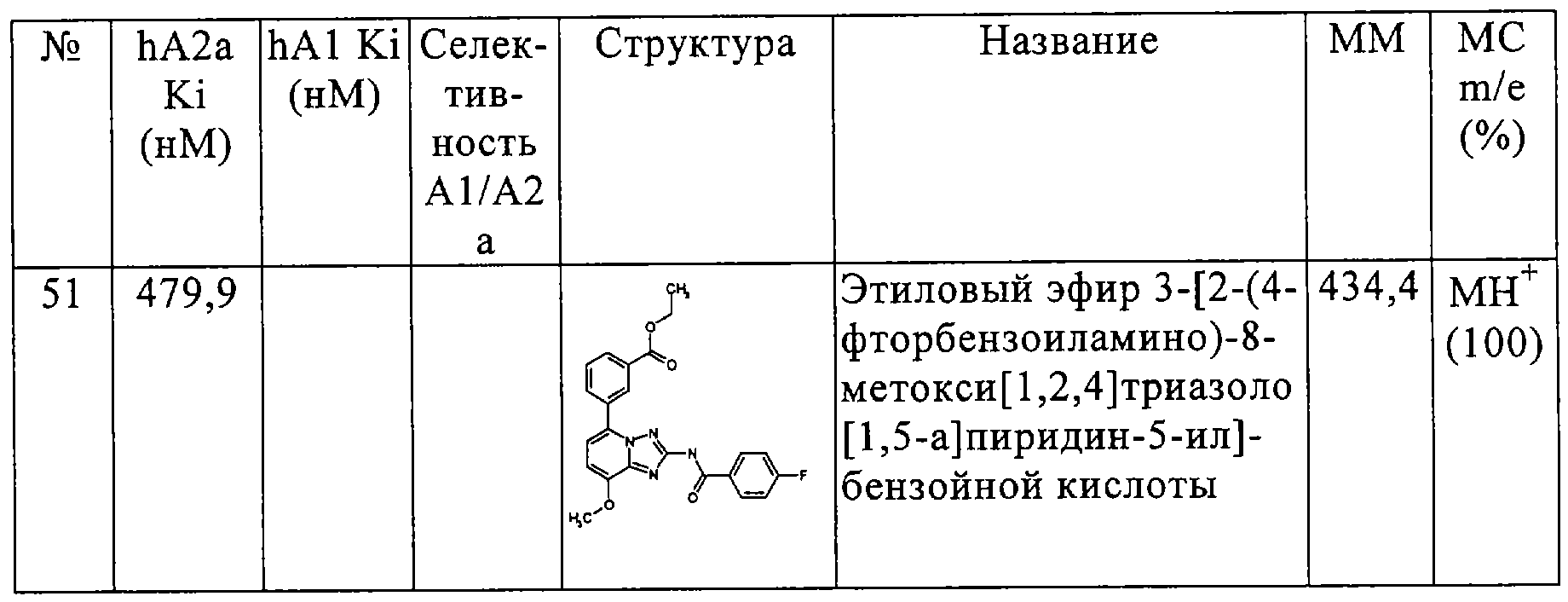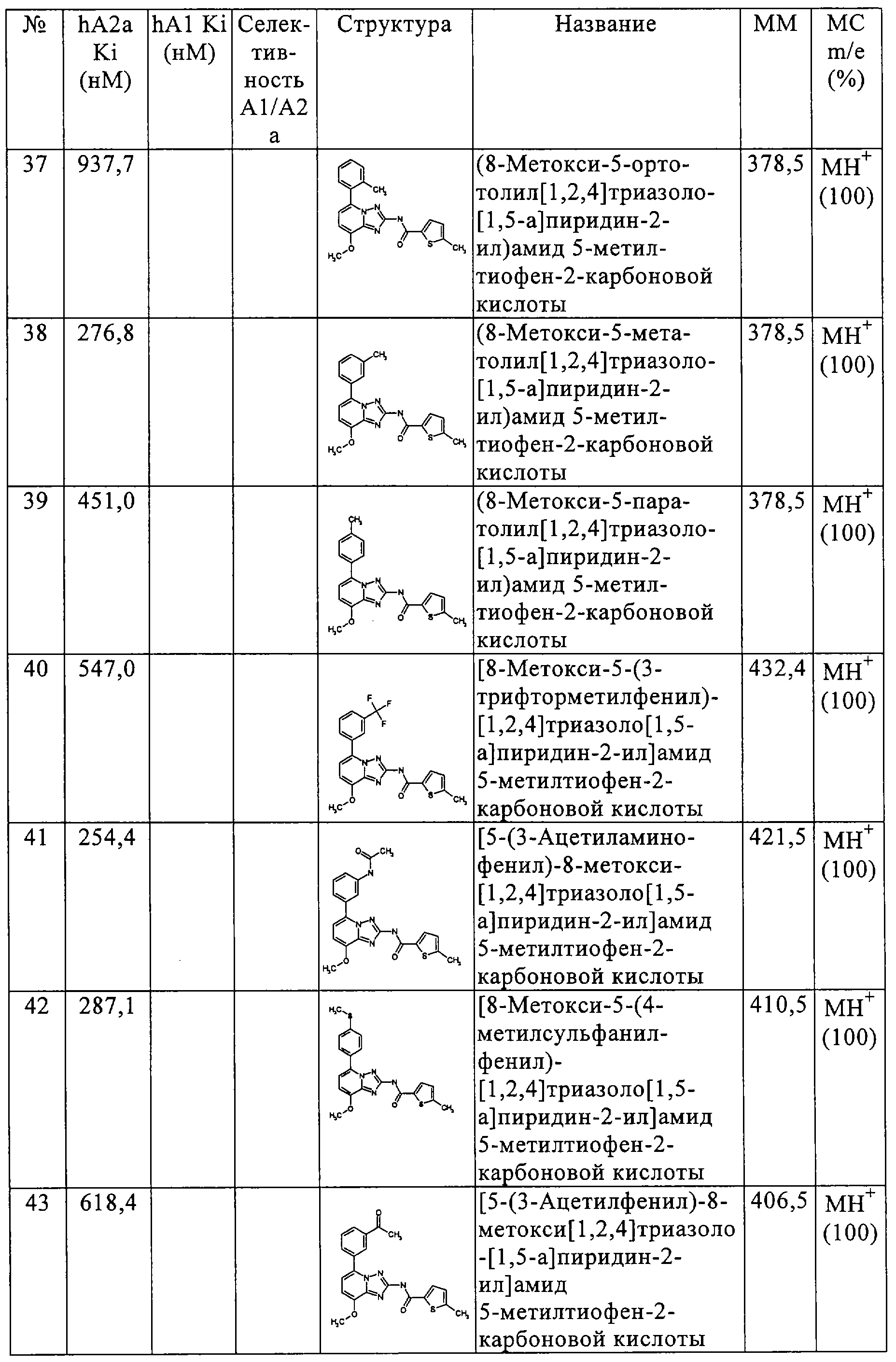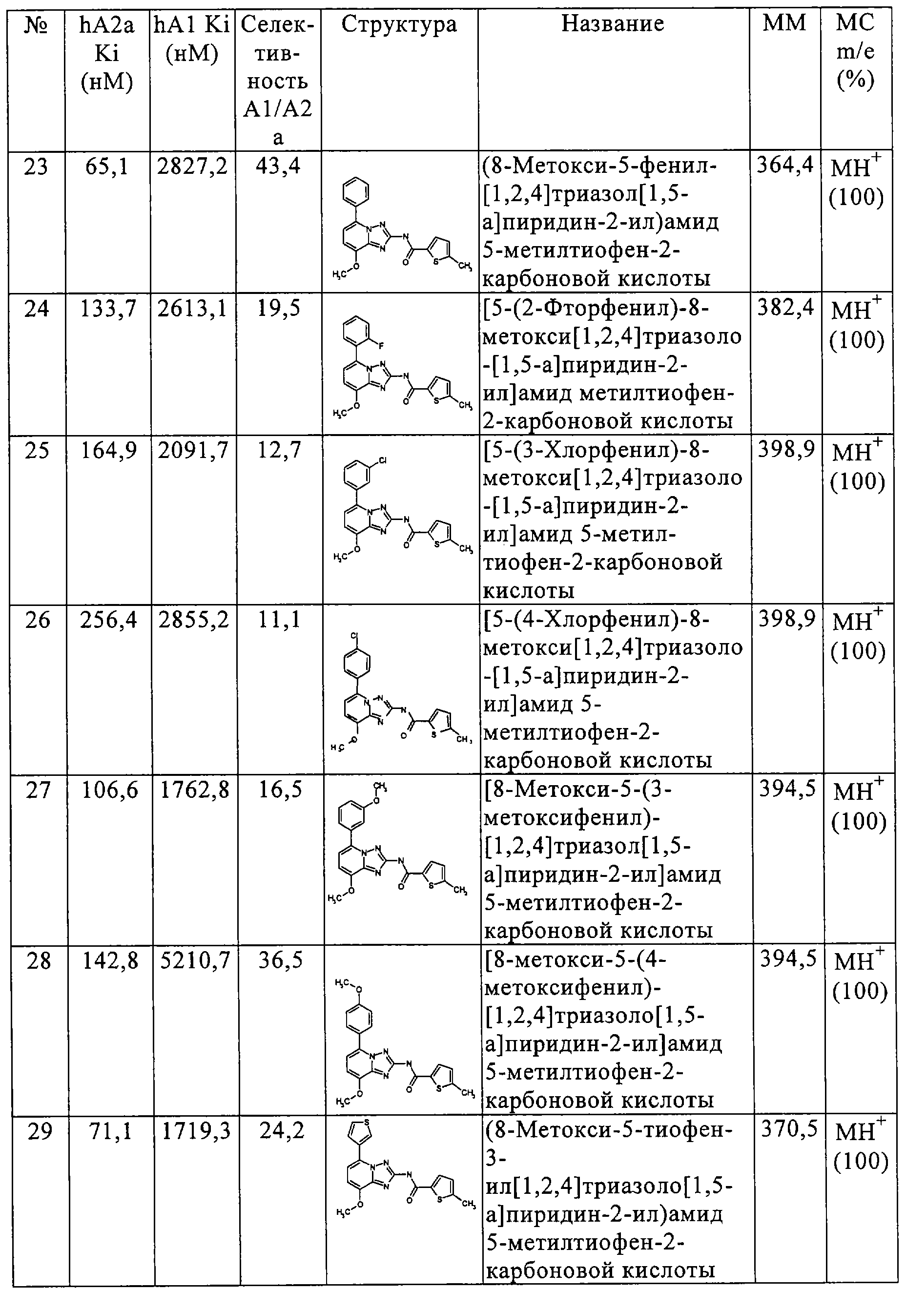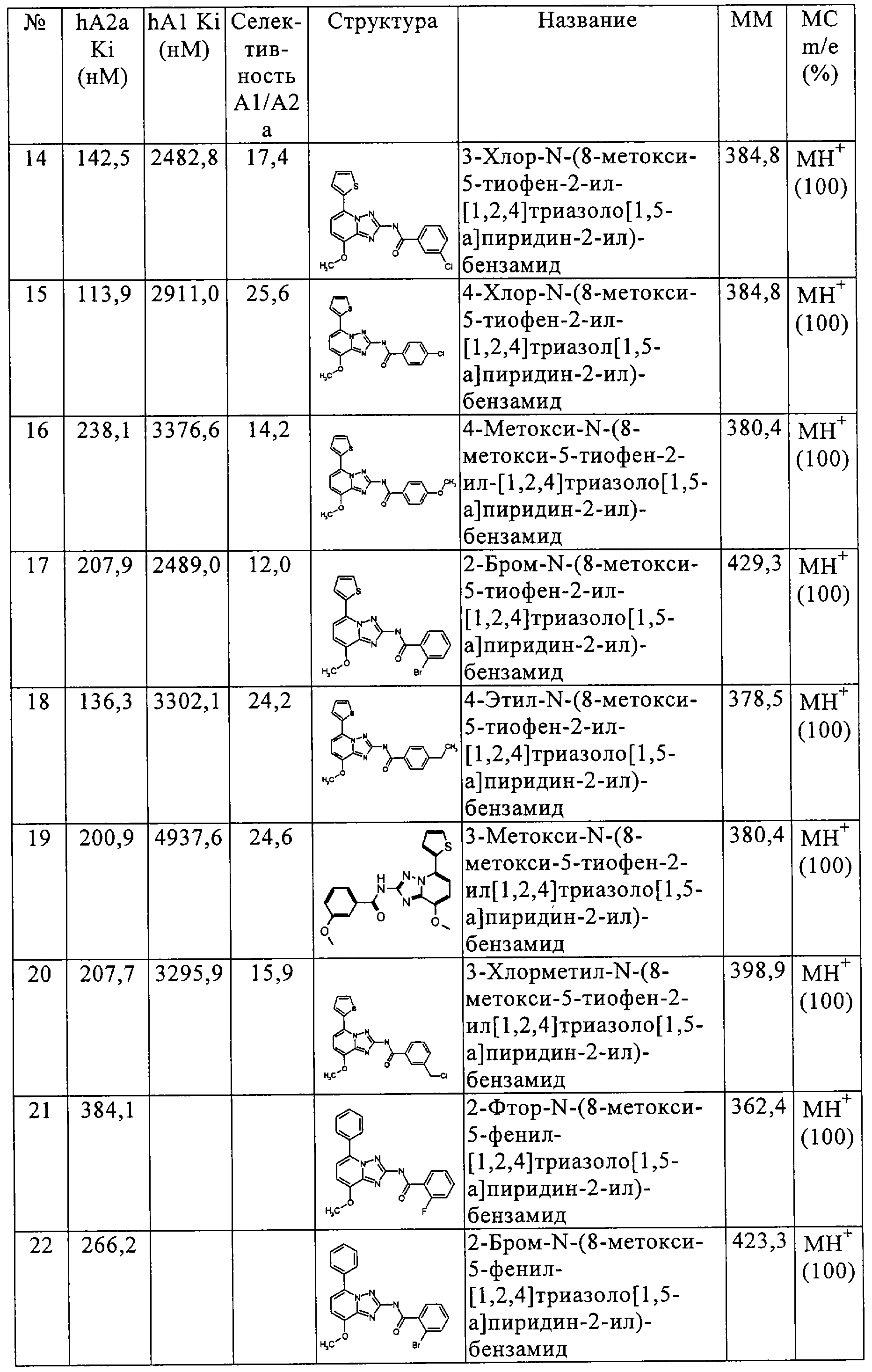 R1 и R2 имеют значения, указанные выше. На схеме показан способ получения производных 8-метокси[1,2,4]триазол[1,5-а]пиридина из соединения формулы VII (коммерческий препарат). К суспензии КОН в ДМСО добавляют 2-амино-3-гидроксипиридин (VII) и раствор перемешивают. Затем добавляют метилиодид и получают соединение VIII. Смесь соединения VIII и этоксикарбонилизотиоцианата в диоксане перемешивают при комнатной температуре с образованием соединения IX. Затем к раствору гидрохлорида гидроксиламина и н-этилдиизопропиламина в смеси метанол/этанол добавляют N-(3-метокси-2-пиридинил)-N’-карбоэтокситиомочевину с образованием соединения формулы X. Полученное соединение, 8-метокси[1,2,4]триазоло[1,5-а]пиридин-2-иламид, растворяют в соединении формулы R2COCl (III) с образованием соединения формулы IV. Соединение формулы III может представлять собой бензоилхлорид, 4-F-бензоилхлорид, циклогексанхлоркарбонил и т.п. Кроме того, соединение формулы Х можно растворить в серной кислоте, а затем нагреть до приблизительно 100°С и по частям в течение 1 ч добавить KIO3. Затем в полученном соединении формулы Х атом йода заменяют на заместитель R1, при этом в качестве исходного соединения используют 8-метокси-5-иод[1,2,4]триазоло[1,5-а]пиридин-2-иламин, а в качестве реагента – соответствующую бороновую кислоту или сложный эфир, например, как приведенные в следующем списке, при этом получают соединение формулы I. Получение соли проводят при комнатной температуре известными способами, в том числе специалистам в данной области техники. При этом речь идет как о солях неорганических кислот, так и о солях органических кислот. Примерами таких солей являются гидрохлориды, гидробромиды, сульфаты, нитраты, цитраты, ацетаты, малеаты, сукцинаты, метансульфонаты, пара-толуолсульфонаты и т.п. Соединения формулы I и их фармацевтически приемлемые кислотно-аддитивные соли обладают ценными фармакологическими свойствами. Установлено, что соединения по настоящему изобретению прежде всего являются лигандами рецептора аденозина. Биологическую активность соединений определяли по следующей методике. Связывание с аденозиновым рецептором А2А человека Аденозиновый рецептор А2А человека рекомбинантно экспрессировали в яйцеклетках китайского хомячка (СНО) при использовании системы экспрессии вируса леса Семлики. Клетки собирали, дважды промывали центрифугированием, гомогенизировали и вторично промывали центрифугированием. Промытый осадок, содержащий мембранную фракцию, суспендировали в буферном растворе трис-50 мМ (рН 7,4), содержащем 120 мМ NaCl, 5 мМ KCl, 2 мМ CaCl2 и 10 мМ MgCl2 (буферный раствор А). Анализ связывания [3H]-SCH-58261 (Dionisotti и др., Br. J. Pharmacol., 121, 353 (1997)) проводили в 96-луночных планшетах в присутствии 2,5 мкг мембранного белка, 0,5 мг гранул SPA, покрытых Ysi-поли-L-лизином и 0,1 ед. аденозиндеаминазы в конечном объеме 200 мкл буфера А. Неспецифическое связывание определяли в присутствии родственного соединения ксантинамина (ХАС, 2 мкМ). Связывание анализируемых соединений определяли при 10 концентрациях от 10 мкМ до 0,3 нМ. Все анализы выполняли в повторных экспериментах и повторяли по меньшей мере дважды. Аналитичекие планшеты инкубировали при комнатной температуре в течение 1 ч, центрифугировали и определяли количество связанного лиганда, содержащего радиоактивную метку, на сцинтилляционном счетчике (Packard Topcount). Величины IC50