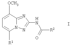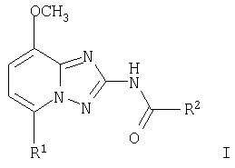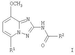 где R1 означает фенил, незамещенный или замещенный одним заместителем, выбранным из группы, включающей галоген, трифторметил, (низш.)алкил, (низш.)алкокси, ацетиламино, ацетил, (низш.)алкенил, -С(O)O-(низш.)алкил или тио(низш.)алкил, или тиофенил, возможно замещенный галогеном, или индолил; R2 означает фенил, незамещенный или замещенный одним заместителем, выбранным из группы, включающей галоген, (низш.)алкил, галоген(низш.)алкил или (низш.)алкокси, или тиофенил возможно замещенный (низш.)алкилом, и их фармацевтически приемлемые соли. 2. Соединение формулы I по п.1, где R1 означает тиофенил, а R2 означает фенил, незамещенный или замещенный галогеном или (низш.)алкилом. 3. Соединение формулы I по п.2, в котором соединение представляет собой: 4-бром-N-(8-метокси-5-тиофен-2-ил[1,2,4]триазоло[1,5-а]пиридин-2-ил)бензамид, N-(8-метокси-5-тиофен-2-ил[1,2,4]триазоло[1,5-а]пиридин-2-ил)бензамид, 3-хлор-N-(8-метокси-5-тиофен-2-ил[1,2,4]триазоло[1,5-а]пиридин-2-ил)бензамид, 4-хлор-N-(8-метокси-5-тиофен-2-ил[1,2,4]триазоло[1,5-а]пиридин-2-ил)бензамид или 4-этил-N-(8-метокси-5-тиофен-2-ил[1,2,4]триазоло[1,5-а]пиридин-2-ил)бензамид. 4. Соединение формулы I по п.1, где R1 означает фенил, незамещенный или замещенный (низш.)алкокси, а R2 означает фенил, незамещенный или замещенный галогеном. 5. Соединение формулы I по п.4, где соединение представляет собой: 4-фтор-N-(8-метокси-5-фенил[1,2,4]триазоло[1,5-а]пиридин-2-ил)бензамид, 3-бром-N-(8-метокси-5-фенил[1,2,4]триазоло[1,5-а]пиридин-2-ил)бензамид, 4-бром-N-(8-метокси-5-фенил[1,2,4]триазоло[1,5-а]пиридин-2-ил)бензамид или N-[5-(3-этоксифенил)-8-метокси[1,2,4]триазоло[1,5-а]пиридин-2-ил]-4-фторбензамид. 6. Соединение формулы I по п.1, где R1 означает фенил, незамещенный или замещенный галогеном или (низш.)алкокси, а R2 означает тиофенил, незамещенный или замещенный (низш.)алкилом. 7. Соединение формулы I по п.6, где соединение представляет собой: (8-метокси-5-фенил[1,2,4]триазоло[1,5-а]пиридин-2-ил)амид 5-метилтиофен-2-карбоновой кислоты, [5-(2-фторфенил)-8-метокси[1,2,4]триазоло[1,5-а]пиридин-2-ил]амид 5-метилтиофен-2-карбоновой кислоты, [8-метокси-5-(3-метоксифенил)[1,2,4]триазоло[1,5-а]пиридин-2-ил]амид 5-метилтиофен-2-карбоновой кислоты, [8-метокси-5-(4-метоксифенил)[1,2,4]триазоло[1,5-а]пиридин-2-ил]амид 5-метилтиофен-2-карбоновой кислоты, [5-(3-этоксифенил)-8-метокси[1,2,4]триазоло[1,5-а]пиридин-2-ил]амид 5-метилтиофен-2-карбоновой кислоты или [5-(3-фторфенил)-8-метокси[1,2,4]триазоло[1,5-а]пиридин-2-ил]амид 5-метилтиофен-2-карбоновой кислоты. 8. Соединение формулы I по п.1, где R1 означает тиофенил, незамещенный или замещенный галогеном, а R2 означает тиофенил, незамещенный или замещенный (низш.)алкилом. 9. Соединение формулы I по п.8, где соединение представляет собой: (8-метокси-5-тиофен-3-ил[1,2,4]триазоло[1,5-а]пиридин-2-ил]амид 5-метилтиофен-2-карбоновой кислоты или [5-(5-хлортиофен-2-ил)-8-метокси[1,2,4]триазоло[1,5-а]пиридин-2-ил]амид 5-метилтиофен-2-карбоновой кислоты. 10. Фармацевтический препарат, обладающий антагонистическим действием на аденозиновый рецептор А2A, содержащий одно или более соединений формулы I по одному из пп.1-9 и фармацевтически приемлемые эксципиенты.