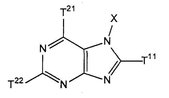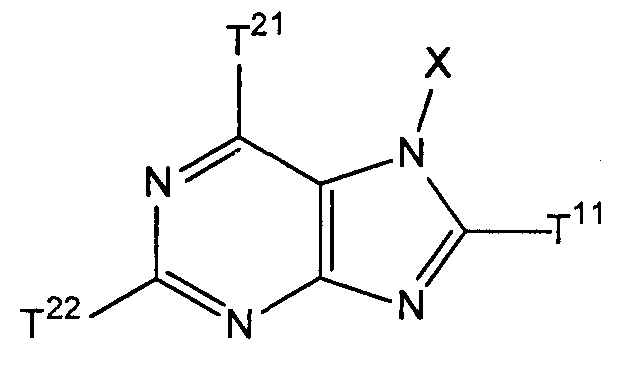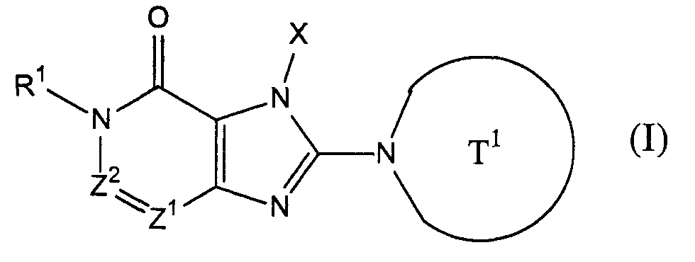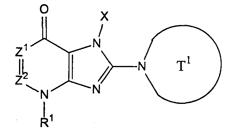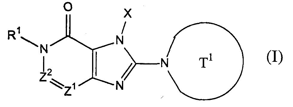 где Т1 представляет собой моноциклическую 5-6-членную гетероциклическую группу, содержащую один или два атома азота в кольце, и которая может иметь одну или более аминогруппу в качестве заместителей; Х представляет собой С2-6 алкенильную группу, которая может иметь один или несколько заместителей, С2-6 алкинильную группу, фенильную группу, которая может иметь один или несколько заместителей, выбранных из алкильной группы, или галогена, или фенил C1-6 алкильной группы; Z1 и Z2, каждый независимо, представляют собой атом азота или группу формулы -CR2=; R1 и R2, каждый независимо, представляют собой группу формулы -А0-А1-А2 (где А0 представляет собой одинарную связь или С1-6 алкиленовую группу, которая может иметь 1-3 заместителя, выбранных из группы В, состоящей из указанных ниже заместителей; А1 представляет собой одинарную связь, атом кислорода, атом серы, сульфинильную группу, сульфонильную группу, карбонильную группу, группу, представленную формулой -O-СО-, группу, представленную формулой -СО-O-, группу, представленную формулой -NRA, группу, представленную формулой -CO-NRA, группу, представленную формулой -NRACO-, группу, представленную формулой -SO2-NRA, или группу, представленную формулой -NRA-SO2-; А2 и RA, каждый независимо, представляют собой атом водорода, атом галогена, цианогруппу, C1-6 алкильную группу, С3-8 циклоалкильную группу, С2-6 алкенильную группу, С2-6 алкинильную группу, С6-10 арильную группу, 5-10-членную гетероарильную группу, 4-8-членную гетероциклическую группу, 5-10-членный гетероарил C1-6 алкильную группу, С6-10 арил C1-6 алкильную группу, или С2-7 алкилкарбонильную группу, причем А2 и RA, каждый независимо, могут иметь 1-3 заместителя, выбранных из указанной ниже группы заместителей В, когда Z2 представляет собой группу формулы -CR2=, R1 и R2 могут вместе образовывать 5-7-членное кольцо, за исключением случаев, когда [1] R1 представляет собой атом водорода, Z1 представляет собой атом азота и Z2 представляет собой группу -СН=; [2] Z1 представляет собой атом азота и Z2 представляет собой группу -С(ОН)=; <Группа заместителей В> группа заместителей В представляет собой группу, включающую гидроксильную группу, меркаптогруппу, цианогруппу, нитрогруппу, атом галогена, трифторметильную группу, С1-6 алкильную группу, которая может иметь один или несколько заместителей, С3-8 циклоалкильную группу, С2-6 алкенильную группу, С2-6 алкинильную группу, С6-10 арильную группу, 5-10-членную гетероарильную группу, 4-8-членную гетероциклическую группу, С1-6 алкоксигруппу, С1-6 алкилтиогруппу, группу, представленную формулой -SO2-NRB1-RB2, группу, представленную формулой -NRB1CO-RB2, группу, представленную формулой -NRB1-RB2 (где RB1 и RB2, каждый независимо, представляют собой атом водорода или С1-6 алкильную группу), группу, представленную формулой -CO-RB3 (где RB3 представляет собой 4-8-членную гетероциклическую группу), группу, представленную формулой -CO-RB4-RB5, и группу, представленную формулой -СН2-СО-RB4-RВ5 (где RВ4 представляет собой одинарную связь, атом кислорода или группу, представленную формулой -NRB6-; RB5 и RB6, каждый независимо, представляют собой атом водорода, C1-6 алкильную группу, С3-8 циклоалкильную группу, С2-6 алкенильную группу, С2-6 алкинильную группу, С6-10 арильную группу, 5-10-членную гетероарильную группу, 4-8-членный гетероцикл C1-6 алкильную группу, С6-10 арил C1-6 алкильную группу или 5-10-членный гетероарил C1-6 алкильную группу)). Также 