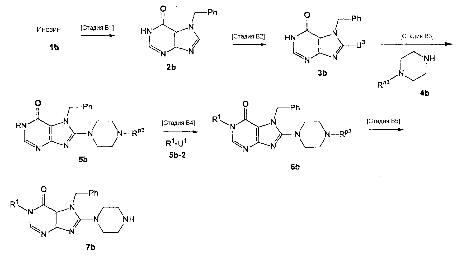Группа заместителей В представляет собой группу, включающую гидроксильную группу, меркаптогруппу, цианогруппу, нитрогруппу, атом галогена, трифторметильную группу, С1-6 алкильную группу, которая может содержать один или несколько заместителей, С3-8 циклоалкильную группу, С2-6 алкенильную группу, С2-6 алкинильную группу, С6-10 арильную группу, 5-10-членную гетероарильную группу, 4-8-членную гетероциклическую группу, С1-6 алкоксигруппу, С1-6 алкилтиогруппу, группу, представленную формулой -SO2-NRB1-RB2, группу, представленную формулой -NRB1-CO-RB2, группу, представленную формулой -NRB1-RB2 (где RB1 и RB2, каждый независимо, представляют собой атом водорода или С1-6 алкильную группу), группу, представленную формулой -СО-RB3 (где RB3 представляет собой 4-8-членную гетероциклическую группу), группу, представленную формулой -CO-RB4-RB5, и группу, представленную формулой -СН2-СО-RB4-RB5 (где RB4 представляет собой одинарную связь, атом кислорода или группу, представленную формулой -NRB6-; RB5 и RB6, каждый независимо, представляют собой атом водорода, С1-6 алкильную группу, С3-8 циклоалкильную группу, С2-6 алкенильную группу, С2-6 алкинильную группу, С6-10 арильную группу, 5-10-членную гетероарильную группу, 4-8-членную гетероциклил С1-6 алкильную группу, С6-10 арил С1-6 алкильную группу или 5-10-членную гетероарил С1-6 алкильную группу)), и