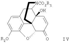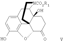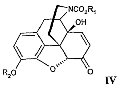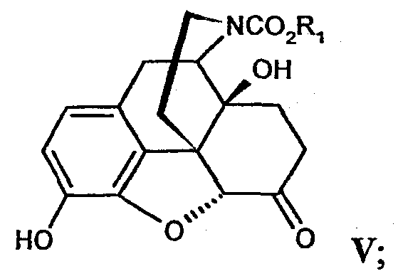путем взаимодействия со сложным эфиром галоформиата формулы X-C(=О)OR1, где R1 имеет указанные ранее значения, Х представляет собой галоген, с последующим взаимодействием с R2-X, где Х и R2 имеют указанные ранее значения, с получением производного морфина формулы II, как определено в п.16; (b) окисление морфина формулы II с получением производного морфинона формулы III в соответствии со способом, описанным в п.16; (c) окисление производного морфинона формулы III с получением производного 14-гидроксинорморфинона формулы IV в соответствии со способом, описанным в п.1; (d) снятие защиты с положения 3 и восстановление двойной связи в положении 7, 8 производного 14-гидроксинорморфинона формулы IV с получением производного 3,14-гидроксинорморфинона формулы V