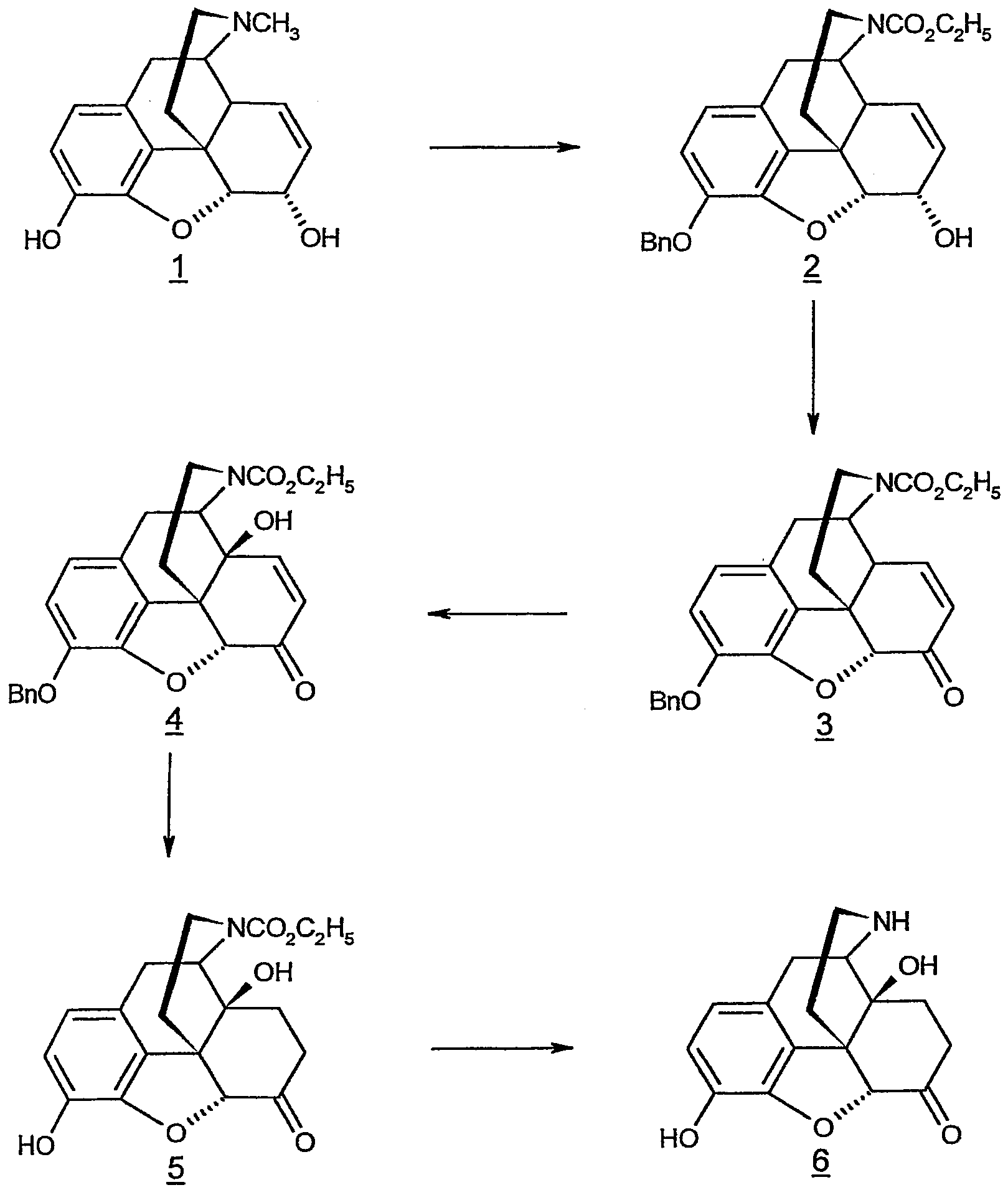 с любым окислителем, эффективным для окисления аллильных гидроксигрупп с образованием кетогрупп, что приводит к получению соединения морфинона формулы III. Предпочтительно окислителем является дихромат натрия. Предпочтительно R1 представляет собой этил, R2 наиболее предпочтительно представляет собой бензил. Новый способ в соответствии с данным изобретением может быть подходящим образом использован для получения нороксиморфона. Поэтому другой аспект данного изобретения относится к способу получения нороксиморфона, включающему стадию взаимодействия, на которой соединение морфинона формулы III окисляют до производного 14-гидроксинорморфинона формулы IV. В частности, предпочтительным является способ, дополнительно включающий окисление производного морфина формулы II с получением соединения формулы III, как описано выше. Особенно предпочтительным является способ получения нороксиморфона, включающий следующие стадии: (а) превращение морфина, имеющего формулу I путем взаимодействия со сложным эфиром галоформиата формулы Х-С(=О)OR1, где R1 имеет указанные ранее значения, и Х представляет собой галоген (F, Cl, Br или I, предпочтительно, Cl), с последующим взаимодействием с R2-Х, где Х (предпочтительно, Cl) и R2 имеют указанные ранее значения, с получением производного морфина формулы II; (b) окисление морфина формулы II с получением производного морфинона формулы III в соответствии с ранее описанным способом; (с) окисление производного морфинона формулы III с получением производного 14-гидроксинорморфинона формулы IV в соответствии с ранее описанным способом; (d) снятие защиты с положения 3 и (одновременно) восстановление двойной связи в положении 7,8 производного 14-гидроксинорморфинона формулы IV с получением производного 3,14-гидроксинорморфинона формулы V с применением способов, хорошо известных в данной области техники для взаимодействия такого типа, например, с применением водорода и палладия на углероде в качестве катализатора, (е) гидролиз производного 3,14-гидроксинорморфинона формулы V с получением нороксиморфона формулы VI с применением способов, хорошо известных в данной области техники для гидролиза такого типа, например, с применением серной кислоты В соответствии со способом получения нороксиморфона каждое из новых промежуточных соединений формул II, III и IV относится к разным аспектам настоящего изобретения. В частности, промежуточные соединения формул II, III и IV являются предпочтительными в том случае, когда R1 представляет собой этил. Также предпочтительными являются промежуточные соединения формул II, III и IV, в которых R2 представляет собой бензил. Наиболее предпочтительными являются промежуточные соединения формул II, III и IV, в которых R1 представляет собой этил, и R2 представляет собой бензил. Далее данное изобретение проиллюстрировано следующим примером. ПРИМЕР 1 Подчеркнутые цифры относятся к цифрам структур на схеме I (Bn = бензил). Сложный этиловый эфир (5 Морфин (1, 8 г) растворяют в 80 мл толуола и раствор сушат азеотропной дистилляцией воды. Добавляют карбонат натрия (15 г) и бикарбонат натрия (6 г) и раствор вновь сушат азеотропной дистилляцией. Медленно и по порциям в течение приблизительно 4 часов при 78°С добавляют этилхлорформиат (30 г). Завершение реакции проверяют при помощи ТСХ. Избыток реагента и солей растворяют, добавляя воду. Сло