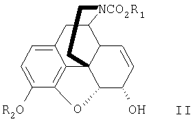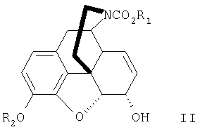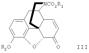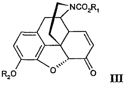 с окислителем, эффективным для окисления аллильных гидроксигрупп с получением кетогрупп, в результате получают соединение формулы III, как указанно в п.1, при этом R1 и R2 имеют значения, указанные в п.1. 17. Способ по п.16, в котором окислитель представляет собой дихромат натрия. 18. Способ по п.16 или 17, в котором R1 представляет собой этил. 19. Способ по п.16 или 17, в котором R2 представляет собой бензил. 20. Производное морфина формулы II