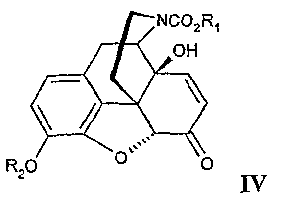 Данное изобретение относится к способу получения производных 14-гидроксинорморфинона, к новому синтетическому направлению получения нороксиморфона, а также к новым промежуточным соединениям указанного направления. Нороксиморфон является ключевым промежуточным соединением для получения важных лекарственных опиоидов, таких как налтрексон и налоксон. Общим исходным материалом для получения указанных опиоидов является тебаин, из которого они могут быть легко синтезированы. Однако тебаин в естественном виде содержится в небольших количествах только в головках мака и опии. Поскольку поставки тебаина ограничены, а потребность в нем увеличивается, разрабатывались многие альтернативные подходы для получения производных 14-гидроксиморфина. См., к примеру, ЕР 0158476, US 5922876, а также приведенные в данном описании ссылки. Кроме того, в попытке удовлетворить потребность в тебаине (его получении) Coop et al. (Tetrahedron 55 (1999), 11429-11436; WO 00/66588) недавно описали окислительный способ получения 14-гидроксикодеинона из кодеинона с выходом 51% и применением Со(ОАс)3 в качестве металлического оксиданта в уксусной кислоте при комнатной температуре. Согласно Соор, другие окислительные условия для металлических оксидантов, таких как Со(ОАс)3, при других условиях, FeCl3, Со(ОАс)2 в сочетании с несколькими сооксидантами, RuO4, Mn(OAc)3, Cu(OAc)2 и пр., оказались не очень подходящими. Неожиданно и несмотря на разработку Соор было обнаружено, что при получении производных 14-гидроксинорморфинона формулы IV из соединений формулы III в качестве эффективных оксидантов могут быть использованы соли кобальта (II) в том случае, когда взаимодействие осуществляют в присутствии слабого основания, а в качестве сооксиданта применяют кислород или воздух. Следовательно, данное изобретение относится к способу получения производных 14-гидроксинорморфинона формулы IV включающему взаимодействие соединения формулы III с оксидантом кобальтом (II) в присутствии слабого основания и воздуха или кислорода в качестве кооксиданта; где R1 представляет собой (1-7С)алкил, необязательно замещенный одним или несколькими атомами хлора (такой как 1,1,1-трихлорэтил), бутенил, винил, бензил, фенил или нафтил; R2 представляет собой бензил или бензил, замещенный одной или несколькими (1-6С)алкоксигруппами, или бензил, замещенный одним или несколькими галогенами. Способ окисления в соответствии с настоящим изобретением представляет собой эффективный способ с высоким выходом, существенно улучшенным по сравнению со способом, описанным Coop et al. Оксидант кобальт (II) в соответствии с настоящим изобретением может быть выбран из ряда солей кобальта (II), таких как CoF2, CoCl2, CoBr2, Co(II)сульфат, Со(II)нитрат, Со(II)ацетат, Со(II)пропионат и т.п., и их смесей. Предпочтительным оксидантом в способе в соответствии с данным изобретением является Со(ОАс)2, и предпочтительным сооксидантом является воздух. Реакционная смесь в соответствии с данным способом окисления представляет собой гетерогенную систему; оксидант растворяется только в небольших количествах в применяемом органическом растворителе. Используемое количество солей кобальта (II) не имеет критического значения, пока система является гетерогенной, и специалисту в данной области известно, как выбирать их достаточное количество. Сооксидант вводят в реакционную смесь, барботируя его че